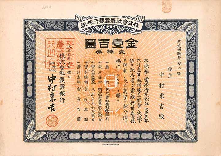 | Vorheriges Los | Zurück | Nächstes Los | | Losnr.: | 211 (Japan) | | Titel: | Bank Noh-San | | Auflistung: | Aktie 100 Yen von 1916. | | Ausruf: | 100,00 EUR | Ausgabe- datum: | 01.01.1916 | | Abbildung: |  | | Besonder-heiten: | Sehr dekorative Gestaltung mit Seidenschmetterlingen und Kokons in der Umrandung, Firmenname mit Eichenlaub dekoriert. Aktientext nur japanisch. | | Erhaltung: | EF. | | Zuschlag: | 120,00 EUR |