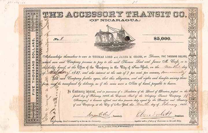 | Vorheriges Los | Zurück | Nächstes Los | | Losnr.: | 36 (U.S.A.) | | Titel: | Accessory Transit Co. (of Nicaragua) | | Auflistung: | 7 % Obl. 5.000 $ 9.2.1856. | | Ausruf: | 9.500,00 EUR | Ausgabe- datum: | 09.02.1856 | Ausgabe- ort: | New York | | Abbildung: |  | | Stücknr.: | 8 | | Info: | 1848 wurde in Kalifornien Gold gefunden. Über 100.000 Goldsucher nur im ersten Jahr sind von der Ostküste nach San Francisco ausgezogen. Es gab noch keine transkontinentale Eisenbahn und auf den Treckstraßen zur Westküste riskierte man Angriffe der Indianer. Darum mußten die riesigen Menschenmassen und die Versorgungsgüter einen Umweg auf der Seeroute um die Südspitze Amerikas in Kauf nehmen. Commodore Cornelius Vanderbilt ( 1794-1877) arbeitete nun einen Plan heraus, um aus eigener Kraft einen Verbindungsweg vom Atlantik zu Pazifik herzustellen, über die Nicaraguaroute. Für die 20 km Dschungel und Gebirge zwischen dem Nicaraguasee und Pazifik wollte Vanderbilt einen Kanal bauen. Die Regierung Nicaraguas war mit seinen Plänen einverstanden. Die von Vanderbilt gegründete "American Atlantic and Pacific Ship Canal Co." bekam das ausschließliche Recht der Durchquerung von Nicaragua von einem Ozean zum anderen. Die Kanalbaupläne wurden zwar recht schnell verworfen, stattdessen ließ Vanderbilt eine Asphaltstraße über die 20 km Urwaldstrecke bauen. Die Transitkonzession für Nicaragua übernahm nun die 1851 gegründete "Accessory Transit Co.", die den Grundstein für Vanderbilts legendäres Vermögen legte. Mit knapp 8 Mio. $ war die "Accessory Transit Co." die höchstkapitalisierte Gesellschaft an der Wall Street, ihre Aktien gehörten zu den meist gehandelten Effekten. Wegen einer fünfmonatigen Abwesenheit übertrug Vanderbilt die Geschäftsführung der "Accessory Transit Co." seinen beiden Teilhabern Charles Morgan und Cornelius Garisson. Kaum hatte sich der Commodore auf seine Europareise begeben, taten sich die beiden mit dem amerikanischen Arzt und Abenteurer William Walker zusammen, um die "Accessory Transit Co." und die Transitkonzession zu übernehmen. Walker sollte die Regierung in Nicaragua stürzen und das Transitabkommen mit der "Accessory Transit Co." widerrufen, um die Konzession einer neuen Gesellschaft zu erteilen, die die beiden dann gründen wollten. Im März 1855 fuhr Walker mit 57 Freibeutern und 20.000 $, die er von Charles T. Morgan bekam, nach Nicaragua los, übernahm dort im Oktober 1855 die Macht. Der von ihm ernannte Präsident widerrief umgehend die Konzession der "Accessory Transit Co." und beschlagnahmte auch Vanderbilts Fluß- und Seedampfer, alle Maultiere und Reisewagen und was sonst der Gesellschaft in Nicaragua gehörte. Am 20.5.1856 erkannte die US-Regierung Walker als legitimen Herrscher Nicaraguas an. Walker heuerte weitere Söldner an, um auch die vier weiteren Staaten Guatemala, El Salvador, Honduras und Costa Rica unter seine Gewalt zu bringen. Vanderbilt übte nun erfolgreich Druck auf die US-Regierung aus, um die Anerkennung von Walkers Regime zurück zu nehmen und die Kriegsmarine zu entsenden, die dem Spuk ein Ende machte. Im Frühjahr 1858 war die Konzession der "Accessory Transit Co." wiederhergestellt. Daraufhin gaben sich Morgan und andere Rivale geschlagen und bezahlten an Commodore Vanderbilt fortan 672.000 $ (heute mehr als 30 Mio. Euro) jährlich allein dafür, dass er sich aus dem Nicaraguageschäft zurückzog. Mit diesem Geld und mit dem Erlös aus dem Verkauf der Schiffe konnte Vanderbilt knapp zwei Jahre später groß in das Eisenbahngeschäft einsteigen. | | Besonder-heiten: | Der dekorative Bond mit Vignette des Dampfseglers North Star trägt die zweifache Originalsignatur von "Commodore" Cornelius Vanderbilt (1794-1877), vorderseitig als Präsident und rückseitig am 26.8.1856 anlässlich des Empfanges der halbjährlich fälligen Zinsen in Höhe von 175 $. Beide Signaturen sind tadellos und unentwertet. | | Verfügbar: | Museale Rarität. | | Erhaltung: | Schiffsvignette mit Tintenfleck aus der Feder von Commodore Vanderbilt. VF. | | Zuschlag: | 10.500,00 EUR |