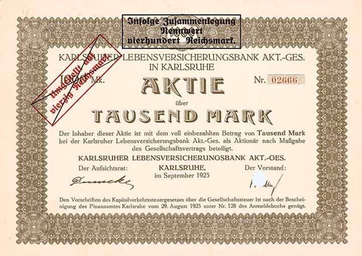 | Vorheriges Los | Zurück | Nächstes Los | | Losnr.: | 1025 (Deutschland 1919-1923 (Die Inflation)) | | Titel: | Karlsruher Lebensversicherungsbank AG | | Auflistung: | Aktie 1.000 Mark Sept. 1923 (Auflage 1000). | | Ausruf: | 200,00 EUR | Ausgabe- datum: | 01.09.1923 | Ausgabe- ort: | Karlsruhe | | Abbildung: |  | | Stücknr.: | 2666 | | Info: | Hervorgegangen aus der 1835 gegründeten "Allgemeinen Versorgungsanstalt im Großherzogtum Baden", die 1903 in “Karlsruher Lebensversicherung auf Gegenseitigkeit vormals Allgemeine Versorgungs-Anstalt” umfirmierte. 1922 Gründung der Karlsruher Lebensversicherungsbank AG, der 1930 der Versicherungsbestand des Gegenseitigkeitsvereins übertragen wurde. 1937 Umbenennung in Karlsruher Lebensversicherung AG. Großaktionäre sind heute die Münchener Rückversicherung und die Allianz. | | Verfügbar: | Weniger als 10 Stück bekannt, letztmals 1999 (!) im GET notiert. | | Erhaltung: | Lochentwertet, sonst UNC-EF. | | Zuschlag: | 240,00 EUR |