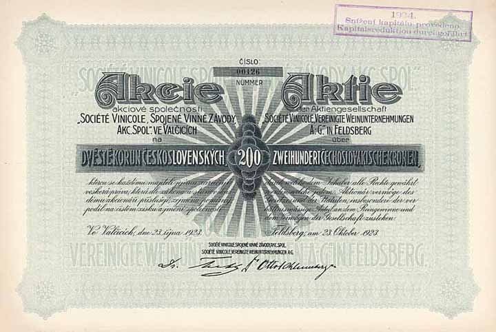 | Vorheriges Los | Zurück | Nächstes Los | | Losnr.: | 478 (k.u.k Monarchie / Nachfolgestaaten) | | Titel: | Société Vinicole, Vereinigte Weinunternehmungen AG | | Auflistung: | Aktie 200 Kc. 23.10.1923. Gründeraktie (Auflage 10000). | | Ausruf: | 60,00 EUR | Ausgabe- datum: | 23.10.1923 | Ausgabe- ort: | Feldsberg | | Abbildung: |  | | Stücknr.: | 141 | | Info: | Gründer waren die Champagne Heidsieck & Co. Monopole S.A. succ. de Heidsieck & Co. in Reims, die Vöslauer Goldeck AG und die Vermouth-Cinzano AG in Turin. Erzeugung von Schaumweinen sowie Handel mit in- und ausländischen Weinen. | | Besonder-heiten: | Mit Faksimile-Unterschrift Dr. Otto Schlumberger. Zweisprachig tschechisch/französisch. | | Erhaltung: | Doppelblatt. EF. | | Zuschlag: | offen |