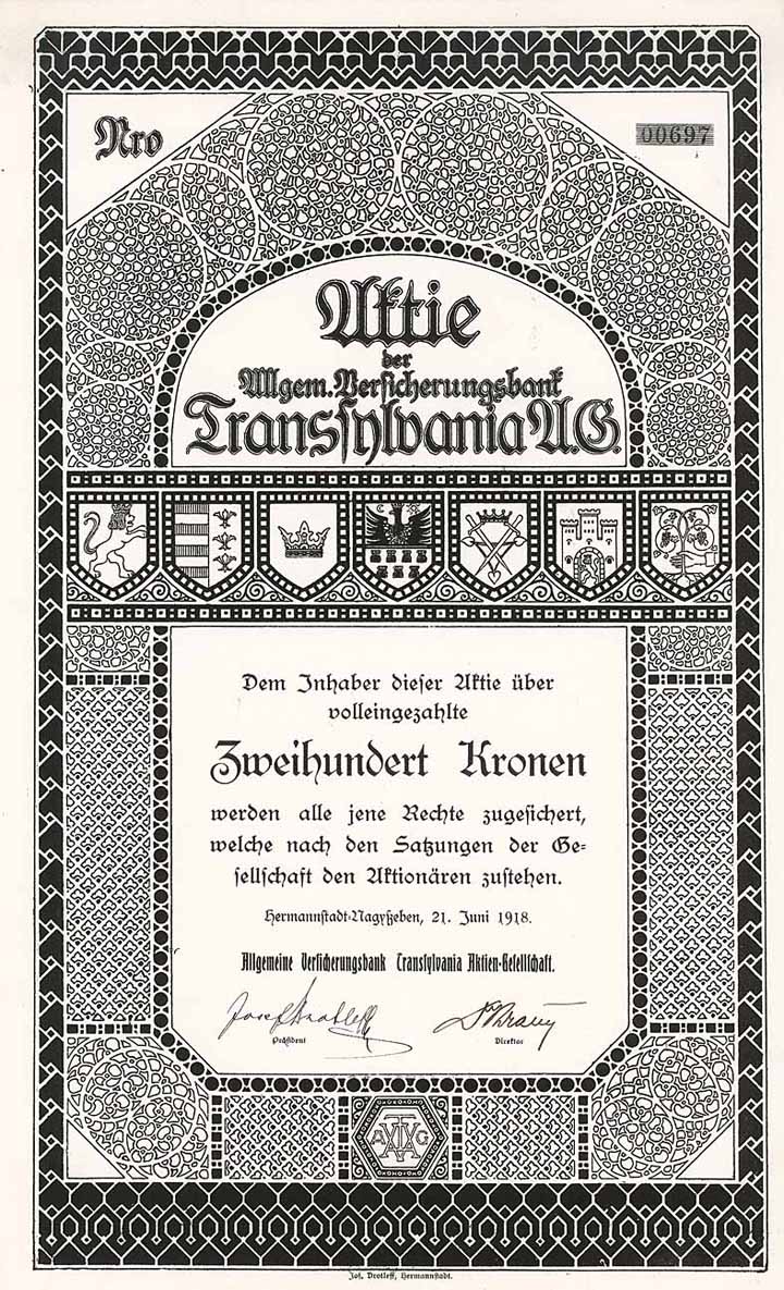 | Vorheriges Los | Zurück | Nächstes Los | | Losnr.: | 450 (k.u.k Monarchie / Nachfolgestaaten) | | Titel: | Allgemeine Versicherungsbank Transsylvania AG | | Auflistung: | Aktie 200 Kr. 21.6.1918. | | Ausruf: | 110,00 EUR | Ausgabe- datum: | 21.06.1918 | Ausgabe- ort: | Hermannstadt | | Abbildung: |  | | Stücknr.: | 697 | | Info: | Gründung 1868 mit einem Stammkapital in Höhe von 300.000 Gulden als genossenschaftlicher Verein. Es wurden die Sparten Feuer-, Leben-, Hagel- und Transportversicherungen betrieben. Auf Initiative Dr. Carl Wolffs, des bedeutenden Volkswirtes der Siebenbürger Sachsen, wurde die Versicherung 1917 in eine AG umgewandelt. Es folgte der Aufbau der Sparte Industrie-Versicherungen. | | Besonder-heiten: | Äußerst dekorative Gestaltung, mit 7 Wappen. | | Erhaltung: | Doppelblatt. EF. | | Zuschlag: | 125,00 EUR |