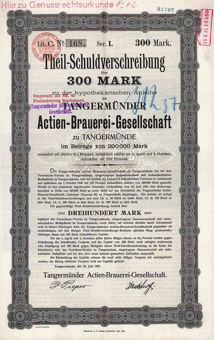 | Vorheriges Los | Zurück | Nächstes Los | | Losnr.: | 942 (Deutschland 1875-1918 (Die Kaiserzeit)) | | Titel: | Tangermünder Actien-Brauerei-Gesellschaft | | Auflistung: | 4,5 % Teilschuldv. 300 Mark 22.6.1901 (Auflage nur 200 Stück). | | Ausruf: | 350,00 EUR | Ausgabe- datum: | 22.06.1901 | Ausgabe- ort: | Tangermünde | | Abbildung: |  | | Stücknr.: | 179 | | Info: | Gründung 1900. Neben dem ziemlich kleinen Aktienkapital von urspr. 457.000 M wurde der Bau der Brauerei an der Lüderitzer Chaussee etwa zur Hälfte durch Anleihen finanziert. Über einen jährlichen Ausstoß von 10-15.000 hl kam die Mini-Brauerei nie hinaus. Im 1. Weltkrieg kam der Betrieb zum Erliegen, 1927 wurde die Auflösung der Gesellschaft beschlossen. | | Besonder-heiten: | Teil einer Anleihe von 200.000 M, arrangiert durch den Vorschuss-Verein zu Tangermünde eGmbH. | | Verfügbar: | Extrem selten. | | Erhaltung: | Doppelblatt, mit Kupons. VF+. | | Zuschlag: | offen |