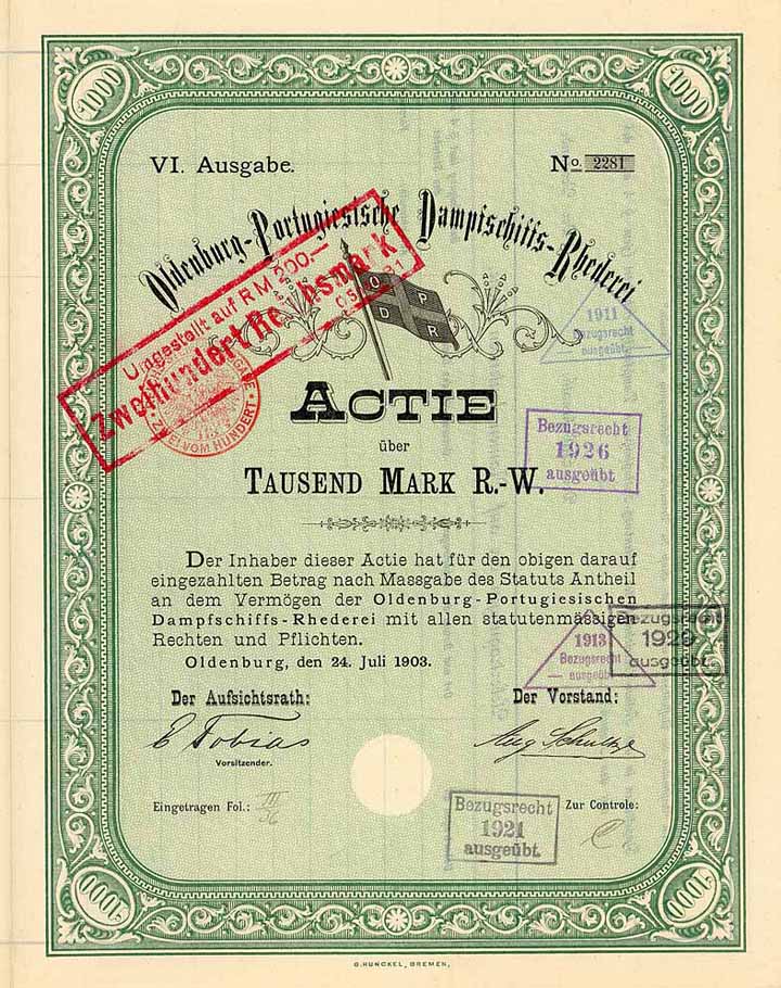 | Vorheriges Los | Zurück | Nächstes Los | | Losnr.: | 895 (Deutschland 1875-1918 (Die Kaiserzeit)) | | Titel: | Oldenburg-Portugiesische Dampfschiffs-Rhederei | | Auflistung: | Actie 1.000 Mark 24.7.1903 (Auflage 700). | | Ausruf: | 150,00 EUR | Ausgabe- datum: | 24.07.1903 | Ausgabe- ort: | Oldenburg | | Abbildung: |  | | Stücknr.: | 2210 | | Info: | Gründung 1883. Liniendienst mit (vor dem ersten Weltkrieg) 20 Dampfern von Hamburg, Bremen, Amsterdam und Rotterdam nach Portugal, Spanien, Marokko und den Kanarischen Inseln (von wo als Rückfracht in großem Umfang Bananen und Tomaten mitgenommen wurden). Später kamen als Abfahrtshäfen auch noch Danzig, Gdingen und Stettin hinzu. 1915 Sitzverlegung nach Hamburg, dort auch börsennotiert. Die O.P.D.G. gehörte zuletzt zum HANIEL-Konzern. 1951 in eine Kommanditgesellschaft umgewandelt. | | Besonder-heiten: | Hochformat, hübscher Druck mit großer Reederei-Flagge. | | Erhaltung: | Doppelblatt. Stück ohne Lochentwertung. EF. | | Zuschlag: | offen |