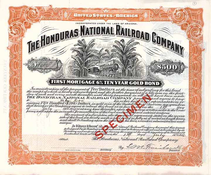 | Vorheriges Los | Zurück | Nächstes Los | | Losnr.: | 504 (Mittel- und Südamerika) | | Titel: | Honduras National Railroad | | Auflistung: | 6 % Mortgage Gold Bond 500 $ 1.7.1910 (Specimen). | | Ausruf: | 300,00 EUR | Ausgabe- datum: | 01.07.1910 | Ausgabe- ort: | Arizona | | Abbildung: |  | | Info: | Gründung 1908 im US-Bundesstaat Arizona. | | Besonder-heiten: | Subskriptionszahlung von 10 $. Wunderschöne Eisenbahnvignette, Originalsignatur des Präsidenten. Rückseitig Anleihenbedingungen. Als Absicherung der Anleihe diente die Verpfändung von 10.000 acres Land, geeignet für Bananenplantagen. | | Verfügbar: | Einzelstück aus Sammlungsauflösung. | | Erhaltung: | EF-VF. | | Zuschlag: | offen |