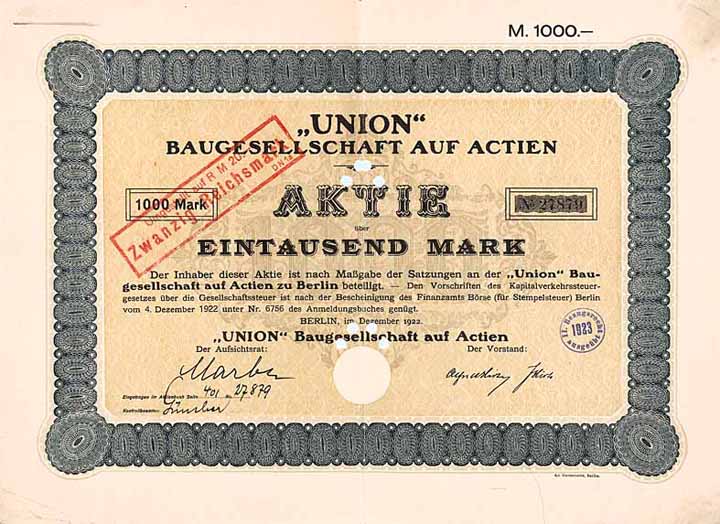 | Vorheriges Los | Zurück | Nächstes Los | | Losnr.: | 1102 (Deutschland 1919-1923 (Die Inflation)) | | Titel: | Union Baugesellschaft auf Actien | | Auflistung: | Aktie 1.000 Mark Dez. 1922. | | Ausruf: | 75,00 EUR | Ausgabe- datum: | 01.12.1922 | Ausgabe- ort: | Berlin | | Abbildung: |  | | Stücknr.: | 27879 | | Info: | Gründung 1872. Traditionsreiche Terraingesellschaft. Verfügte über großen Grundbesitz in Berlin. | | Verfügbar: | Äußerst selten. | | Erhaltung: | Mehrfach lochentwertet. VF+. | | Zuschlag: | offen |