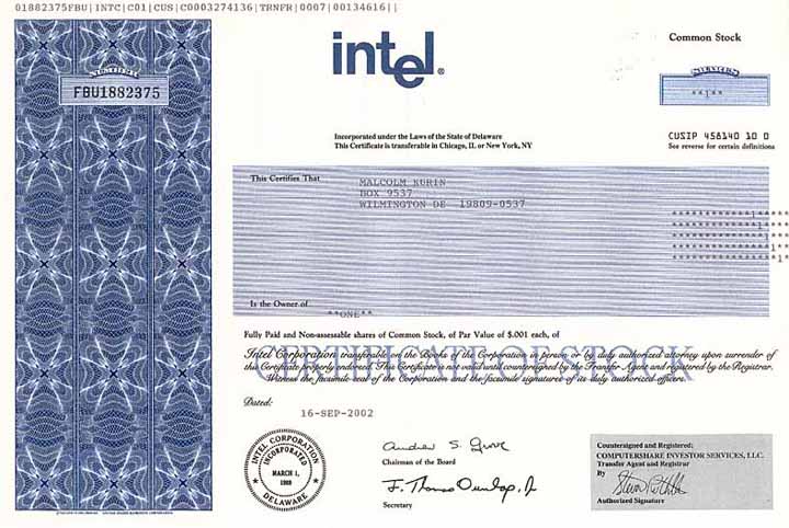 | Vorheriges Los | Zurück | Nächstes Los | | Losnr.: | 127 (U.S.A.) | | Titel: | Intel Corporation | | Auflistung: | 1 share á o,oo1 $ 16.9.2002. | | Ausruf: | 70,00 EUR | Ausgabe- datum: | 16.09.2002 | Ausgabe- ort: | Chicago, Ill. | | Abbildung: |  | | Stücknr.: | 1882375 | | Info: | Intel inside - ein Markenzeichen für jeden Computer. Dies ist eine gültige Aktie des weltweit bekanntesten Herstellers von Microprozessoren. | | Erhaltung: | UNC. | | Zuschlag: | 70,00 EUR v |