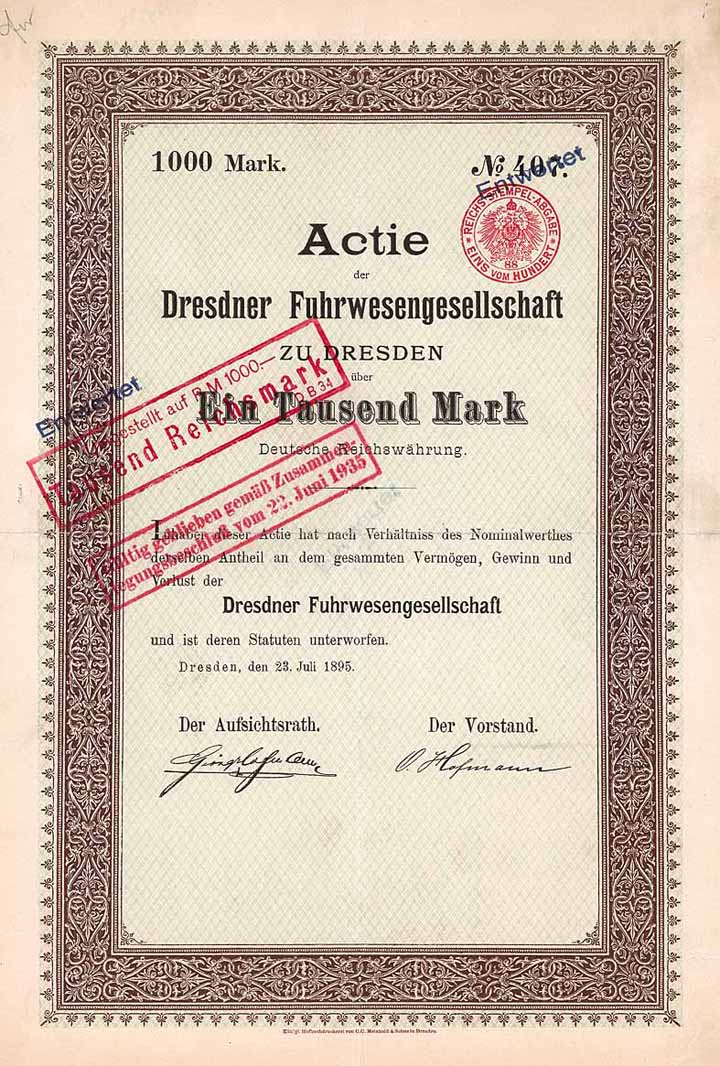 | Vorheriges Los | Zurück | Nächstes Los | | Losnr.: | 819 (Deutschland 1875-1918 (Die Kaiserzeit)) | | Titel: | Dresdner Fuhrwesengesellschaft | | Auflistung: | Actie 1.000 Mark 23.7.1895. Gründeraktie (Auflage zunächst 800, später 500). | | Ausruf: | 200,00 EUR | Ausgabe- datum: | 23.07.1895 | Ausgabe- ort: | Dresden | | Abbildung: |  | | Stücknr.: | 406 | | Info: | Vorgänger waren: Dresdner Fuhrwesen Oswald Hofmann, Dresdner Beerdigungsanstalt "Pietät" und Dresdner Beerdigungsanstalt "Heimkehr". Geschäftszweck: Luxus- und Lastfuhrgeschäft, Beerdigungswesen, Möbeltransport, Kohlenhandel, Holz- und Metallsargfabrikation. Seit 1905 Interessengemeinschaft mit der Speicherei- und Speditions-Gesellschaft Riesa, bei der auch rd. 99 % der Aktien der Dresdner Fuhrwesen lagen. Börsennotiz in Leipzig 1935 eingestellt. Nach der Wende wurde die Gesellschaft reaktiviert. | | Besonder-heiten: | Schöne Ornament-Umrahmung. | | Verfügbar: | NICHT entwertet, in dieser Form äußerst selten. | | Erhaltung: | VF. | | Zuschlag: | offen |