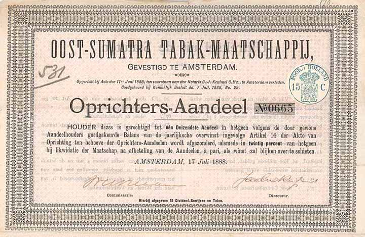 | Vorheriges Los | Zurück | Nächstes Los | | Losnr.: | 538 (Niederlande) | | Titel: | Oost-Sumatra Tabak-Maatschappij | | Auflistung: | Oprichters-Aandeel 17.7.1888. Gründerstück (Auflage 1000). | | Ausruf: | 60,00 EUR | Ausgabe- datum: | 17.07.1888 | Ausgabe- ort: | Amsterdam | | Abbildung: |  | | Stücknr.: | 665 | | Info: | Seit 1601 gründete die holländische Ostindische Kompanie Faktoreien auf Sumatra, der zweitgrößten Insel des Malaiischen Archipels, heute zu Indonesien gehörig. Mitte des 19. Jh. war ganz Sumatra mit Ausnahme von Atjeh niederländisch. Der Krieg gegen Atjeh wurde erst 1895 siegreich beendet. Sumatra wurde mit seinen Naturschätzen zum wichtigsten Gebiet der Niederländisch-Indiens. Die Oost-Sumatra Tabak-Maatschappij wurde gegründet am 11.6.1888 und mit dem Königlichen Beschluss vom 7.7.1888 bestätigt. | | Besonder-heiten: | Originalsignaturen. | | Verfügbar: | Äußerst selten. | | Erhaltung: | Mit kpl. anhängendem Kuponbogen. EF. | | Zuschlag: | 60,00 EUR |