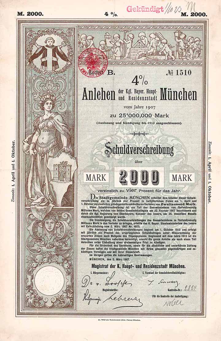 | Previous lot | Back | Next lot | | Lot: | 1008 (Germany until 1945 (No Reichsbank)) | | Title: | Kgl. Bayer. Haupt- und Residenzstadt München | | Details: | 4 % Schuldv. 2.000 Mark 5.3.1907 (Auflage 4375, R 10). | Starting price: | 100,00 EUR | Issuing- date: | 05.03.1907 | | Picture: |  | | Number: | 1510 | | Specials: | Teil einer Anleihe in Höhe von 25 Mio. Mark. Sehr dekorativ mit Bavaria und Münchener Kindl in der Umrandung sowie mit Putten. Die graphische Gestaltung der Anleihe (in der Platte signiert mit Monogramm F. W.) stammt von dem bekannten Münchener Grafiker Fritz Weinhöppel (1863-1908). | | Availability: | Mit Kupons. (R 10) | | Condition: | EF-VF. | | Sold: | 120,00 EUR |
