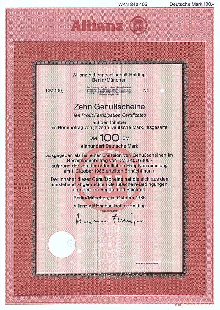 | Previous lot | Back | Next lot | | Lot: | 1917 (Deutschland 1948-2000 (Die Deutsche Mark)) | | Title: | Allianz AG Holding | | Details: | Genußscheine 10 x 10 DM Okt. 1986 (Muster, R 10). | Starting price: | 75,00 EUR | Issuing- date: | 01.10.1986 | Issuing- place: | Berlin/München | | Picture: |  | | Info: | Mit dem Gründungsjahr 1890 war die Allianz ein absoluter Nachzügler unter den deutschen Versicherungen. Doch durch Übernahme von Konkurrenzunternehmen fand man schnell Anschluss an die Spitze: Zum Konzern kam die Versicherungs-AG Fides in Berlin (1905), die Süddeutsche Feuerversicherungs-Bank (1906), der Bayerische Lloyd (1909) und die Kölnische Versicherungs-Bank (1920). 1921 war ein besonders expansives Jahr. Übernommen wurden 5 Versicherungen in Berlin, Karlsruhe und Hamburg, außerdem Gründung der "Kraft" Versicherungs-AG des Automobilclubs von Deutschland sowie Übernahme des deutschen Versicherungsbestandes der Schweiz. National-Versicherungs-Gesellschaft in Basel. 1922 Gründung der Allianz Lebensversicherungsbank. Weit nach vorn kam die Allianz 1923 durch den Erwerb der Aktien der "Bayer. Versicherungs-Bank AG" (vormals Versicherungs-Anstalten der Bayerischen Hypotheken- und Wechsel-Bank). 1927 Fusion mit der Stuttgarter Verein Versicherungs-AG, danach von 1927 bis 1940 Firmierung als "Allianz und Stuttgarter Verein Versicherungs-AG". 2006 Übernahme der italienischen RAS und gleichzeitige Umwandlung in eine Europäische AG (SE = lat. Societas Europaea). Dass übrigens Sitz der von Anfang an "urbayerischen" Gründung formell zuerst Berlin war, hatte einen praktischen Grund: So war der Allianz auch die Geschäftstätigkeit im höchst wichtigen Geschäftsgebiet Preußen erlaubt. | | Availability: | Mit Kuponbogen Muster-perforiert. (R 10) | | Condition: | UNC. | | Sold: | 95,00 EUR |