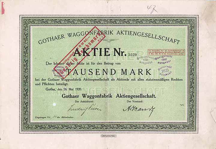 | Previous lot | Back | Next lot | | Lot: | 1805 (Germany until 1945 (Reichsbank)) | | Title: | Gothaer Waggonfabrik AG | | Details: | Aktie 1.000 Mark 26.5.1920 (Auflage 5000, R 8). | Starting price: | 300,00 EUR | Issuing- date: | 26.05.1920 | Issuing- place: | Gotha | | Picture: |  | | Number: | 6592 | | Info: | Ursprung ist eine 1883 von Fritz Bothmann gegründete Schlosserei. 1892 trat der Kaufmann Louis Glück mit in das Unternehmen ein, das nun als “Fritz Bothmann & Glück Maschinenfabrik & Carussellbau-Anstalt” firmierte. Bei Umwandlung in eine AG 1898 arbeiteten auf dem 110.000 qm großen Fabrikareal am Gothaer Ostbahnhof bereits fast 1.000 Beschäftigte. Außer Eisenbahnwaggons wurden ab 1898 (erstmals für die Straßenbahn Mühlhausen i. Thür.) auch Straßenbahnwagen gebaut, später auch Wagen für die Berliner U-Bahn. Neben dem Bau von Eisenbahn-, Straßenbahn- und Triebwagen auch Automobil- und Flugzeugbau. Die Anfang 1913 gegründete Abteilung Flugzeugbau baute vor Beginn des 1. Weltkrieges Ein- und Zweidecker, anschließend zweimotorige Bomber und Seeflugzeuge (insges. 582 Maschinen). Auslöser hierfür war der von der Luftschifffahrt begeisterte letzte regierende Herzog von Sachsen-Coburg und Gotha, Carl Eduard, auf dessen Initiative 1909 der Gothaer Luftfahrtverein am Stadtrand einen Luftschiffhafen einrichtete. 1914 errichtete dann die Heeresverwaltung auf einem Grundstück neben der Waggonfabrik die Militärfliegerkaserne Gotha mit eigenem Flugplatz. Die zweimotorigen Bomber aus der Residenzstadt des Herzogs Carl Eduard (eines gebürtigen Engländers!) erreichten mit 800 km Reichweite erstmals London und wurden durch ihre Einsätze gegen England als “The Gothas” berüchtigt. Aus diesem Grund benannte sich das in Großbritannien regierende Königsgeschlecht Sachsen-Coburg und Gotha um in “die Windsors”. Aufgrund der Bestimmungen des Versailler Vertrages wurde die Flugzeugproduktion in Gotha 1920 zerstört, aber 1933 mit dem Schul-Doppeldecker Go 145 wieder aufgenommen (die Gotha Go 150 wird 1939 mit 8.048 m einen anerkannten Höhenrekord aufstellen). 1916 Erwerb der Bayerischen Waggon- und Flugzeugwerke in Fürth, die als zweites Werk weitergeführt wurden (1938 verkauft). 1921 Fusion mit der Fahrzeugfabrik Eisenach (Automobilwerk "Dixi", 1928 zur Abwendung einer Zahlungsunfähigkeit an BMW verkauft, womit BMW den Grundstein für die heutige Automobilproduktion legte). 1926 Fusion mit der Cyklon Automobilwerke AG, Berlin Tempelhof (Werk Mylau ebenfalls 1928 wieder verkauft). 1936 Beteiligung an der Gotha-Ilmenauer Flugzeugbau GmbH. 1944 wird das Werk in Gotha zu 80 % zerstört. Trotzdem beginnt noch kurz vor Kriegsende in Friedrichroda die Vorserienfertigung des revolutionären Nurflügel-Strahljägers Ho 229 der Gebrüder Horten. Börsennotiz Berlin und Frankfurt, Großaktionär war die Orenstein & Koppel AG (die inzwischen auch die Aktienmehrheit der Waggonfabrik Dessau besaß). 1946 in eine sowjetische Aktiengesellschaft (SAG) umgewandelt, bereits 1947 wieder unter deutsche Verwaltung gestellt, 1949 als VEB Waggonbau Gotha verstaatlicht. 1953-60 werden erneut Segelflugzeugtypen aus der Vorkriegszeit gebaut. Bis 1967 stellt Gotha nicht nur Spezial-Güterwagen her, sondern als einziger Straßenbahnwagenhersteller der DDR auch weitere 3000 Straßenbahnwagen. 1967 wird das Werk in VEB Luft- und Kältetechnik Gotha umbenannt und produziert fortan Lüfter, Kühler und Wasseraufbereiter sowie ab 1983 Fahrgestelle für den PKW Wartburg. Nach der Wende wird das Unternehmen schließlich 1997 von dem Anhänger- und Aufliegerhersteller Schmitz (Cargobull) übernommen und stellt heute als “Schmitz-Gotha Fahrzeugwerke GmbH” mit über 500 Mitarbeitern LKW-Auflieger her. Die 1997 abgespaltene “Gothaer Fahrzeugtechnik GmbH” fertigt mit rd. 400 Beschäftigten Gittermasten und Auslegerverlängerungen für Mobil- und Raupenkräne, aber auch Mulden für Baufahrzeuge. | | Specials: | Schöne Eichenlaub-Umrahmung. Lochentwertet (RB). | | Availability: | Eine echte Rarität, da diese Aktien an sich beim Aktienneudruck 1930 umgetauscht wurden! Nur 20 Stück lagen im Reichsbankschatz. (R 8) | | Condition: | EF-VF. | | Sold: | 360,00 EUR |