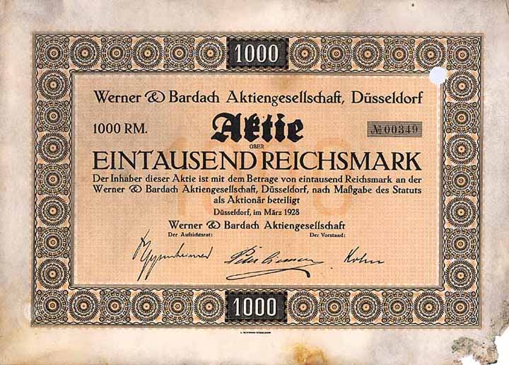 | Previous lot | Back | Next lot | | Lot: | 1894 (Germany until 1945 (Reichsbank)) | | Title: | Werner & Bardach AG | | Details: | Aktie 1.000 RM März 1928 (Auflage 386, R 8, kpl. Aktienneudruck nach Sanierung). | Starting price: | 140,00 EUR | Issuing- date: | 01.03.1928 | Issuing- place: | Düsseldorf | | Picture: |  | | Number: | 356 | | Info: | Gegründet 1922 unter der Firma Werner & Bardach AG, Holz- u. Metallwarenfabrik, 1928 umbenannt wie oben. Hergestellt wurden Badeeinrichtungen, Eisschränke und Kühlanlagen, Spüleinrichtungen, Restaurations- und Ladeneinrichtungen. 1931 Konkurseröffnung. | | Specials: | Lochentwertet (RB). | | Availability: | Nur 15 Stück lagen im Reichsbankschatz. Fleckig. (R 8) | | Condition: | VF-F. | | Sold: | unsold |