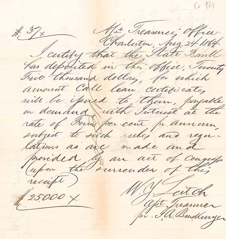 Ein bezeichnendes Licht auf die Selbstherrlichkeit der Amerikaner im Umgang mit dem Rest der Welt wirft übrigens die “Schulden-Regelung” für die CSA-Anleihen nach der Kapitulation der Konföderierten: Um südstaatenfreundliche europäische Anleger (die einen Großteil der CSA-Anleihen gezeichnet hatten) abzustrafen, fügten die Sieger in die Verfassung der Vereinigten Staaten einfach einen Passus ein, wonach den Südstaaten jedwede Bedienung ihrer Schulden verboten wurde. Bis heute hat kein Anleger aus Europa sein damals investiertes Geld wiedergesehen. Da das amerikanische Recht keine Verjährungsfristen kennt, wird über eventuelle Rückzahlungsansprüche, insbesondere der “Mississippi Bonds”, übrigens nach über 150 Jahren noch heute vor US-Gerichten prozessiert! | | Specials: | Handschriftliches Dokument. Das Confederate State Government gab aus Zeitnot und Geldmangel während des gesamten Krieges handgeschriebene Bonds heraus. Während das Government noch auf die regulär gedruckten Bonds vom Finanzministerium wartete, wurden diese handschriftlich aufgesetzten Zertifikate herausgegeben, um so schnell wie möglich an “cash” zu kommen. | | Availability: | Absolute Rarität. | | Condition: | VF. | | Sold: | unsold |