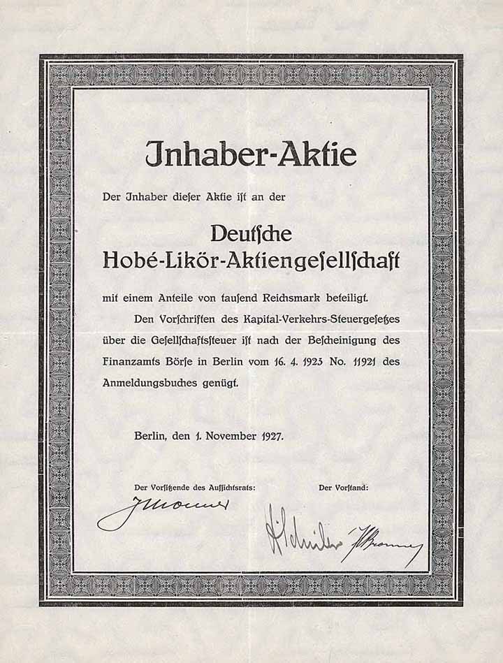 | Previous lot | Back | Next lot | | Lot: | 1521 (Germany until 1945 (No Reichsbank)) | | Title: | Deutsche Hobé-Likör-AG | | Details: | Aktie 1.000 Mark 1.11.1927 (Auflage NUR 100 STÜCK, R 10). | Starting price: | 80,00 EUR | Issuing- date: | 01.11.1927 | Issuing- place: | Berlin | | Picture: |  | | Number: | 11 | | Info: | Gründung 1923 durch die Kahlbaum AG, die zur Schultheiss-Patzenhofer Brauerei gehörte. Herstellung von Likör und Spirituosen. | | Specials: | Originalunterschriften | | Availability: | R 10 | | Condition: | EF-VF. | | Sold: | unsold |