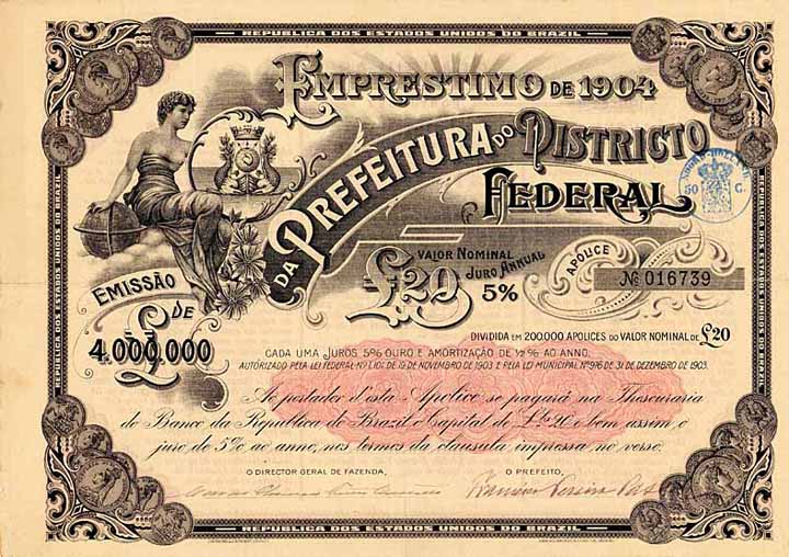 | Previous lot | Back | Next lot | | Lot: | 108 (Brasil-Bonds) | | Title: | Prefeitura do Districto Federal Emprestimo de 1904 | | Details: | 5 % Apolice 20 £ von 1904 (Auflage 200000), no overprint. | Starting price: | 1.000,00 EUR | Issuing- date: | 01.01.1904 | | Picture: |  | | Number: | 45302 | | Specials: | Tolle Gestaltung mit Münzen in allen Ecken. Junge barbusige Frau mit Globus und gekröntem Wappen sitzt auf einer Wolke. Rückseitig Bedingungen in englisch, portugiesich und französisch und runde Vignette mit dem Zuckerhut und Segelschiff in der Bucht von Rio de Janeiro in allen vier Ecken. | | Availability: | Gegengezeichnet von/countersigned by Seligman Brothers Ltd., London. Unentwertet, Kupons 1935-54 anhängend / Uncancelled, coupons 1935-54 attached. | | Condition: | EF-. | | Sold: | 1.350,00 EUR |