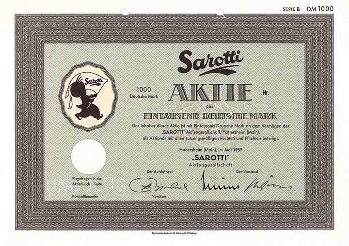 | Previous lot | Back | Next lot | | Lot: | 2157 (Deutschland 1948-Today (Die Deutsche Mark)) | | Title: | Sarotti AG | | Details: | Aktie 1.000 DM Juni 1959 (Blankette, R 10). | Starting price: | 100,00 EUR | Issuing- date: | 01.06.1959 | Issuing- place: | Hattersheim (Main) | | Picture: |  | | Info: | In der Berliner Mohrenstrasse (was später zur Erfindung des berühmten “Sarotti-Mohrs” inspiriert, eines der bekanntesten Warenzeichen der Markenartikelgeschichte) eröffnet Hugo Hoffmann 1868 einen Handwerksbetrieb mit 10 Beschäftigten für die Herstellung feiner Pralinen, Fondants und Fruchtpasten. 1872 erwirbt er zusätzlich die Confiseur-Waaren-Handlung Felix & Sarotti in der Friedrichstrasse. 1883 tritt Paul Tiede als Teilhaber ein, 1889 beschäftigen das Fabrikations- und das Verkaufsgeschäft bereits 90 Mitarbeiter, deren Zahl rapide auf über 1.000 gestiegen ist, als das Unternehmen 1903 in einen Fabrikneubau in der Belle-Alliance-Strasse 83 umzieht und in die “SAROTTI Chocoladen- & Cacao-Industrie AG” umgewandelt wird. Als der Betrieb 1913 in die neu gebaute Fabrik in Tempelhof verlegt wird, liegt die Zahl der Beschäftigten bereits über 2.000. Im Jahr 1918 wird der “SAROTTI-Mohr” gestaltet und in der Werbung verwendet. 1929 entsteht die Verbindung zum Schweizer Nestlé-Konzern, dessen Marken zusätzlich in Lizenz gefertigt werden, nachdem Sarotti im Wege einer Sachkapitalerhöhung die Hattersheimer Schokoladenfabrik der Deutsche AG für Nestlé-Erzeugnisse übernommen hat. 1945 Demontage des Tempelhofer Werkes durch die Besatzungmächte, 1949 Verlegung des Firmensitzes nach Hattersheim (Main). 1962 bei Einweihung des großen Auslieferungslagers in Gladbeck/Westf. hat Sarotti über 4.000 Beschäftigte. 1964/65 Bau einer neuen Fabrik für Schokoladenmassen und Tafelware in Hattersheim, in Folge dessen spezialisiert sich das Tempelhofer Werk 1969 auf Pralinen. Bis 1970 börsennotiert, danach 1971 Übertragung des operativen Geschäfts auf den Großaktionär Deutsche NESTLÉ GmbH und Umfirmierung in “SAROTTI Vermögensverwaltungs-AG”. | | Specials: | Dekorativ, große Vignette mit Sarotti-Mohr. | | Availability: | Ungültig-perforiert. Bislang nicht katalogisierte Emission. (R 10) | | Condition: | UNC-EF. | | Sold: | 100,00 EUR |