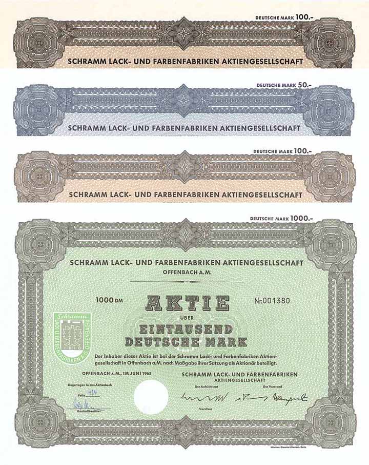 | Previous lot | Back | Next lot | | Lot: | 2166 (Deutschland 1948-Today (Die Deutsche Mark)) | | Title: | Schramm Lack- und Farbenfabriken AG und Schramm AG (7 Stücke) | | Details: | Aktie 100 DM, #2133 Okt. 1951, 100 DM, #9525, 1.000 DM, #1380 Juni 1965, 50 DM, #1207, 1.000 DM, 1643 Aug. 1969, 100 DM, #12624 und 1.000 DM, #2210 Juli 1977. | Starting price: | 100,00 EUR | Issuing- place: | Offenbach/Main | | Picture: |  | | Info: | Gründung 1902 durch Zusammenschluß der Offenbacher Firmen "Chemische Fabriken in Farben und Firnissen Christoph Schramm" (gegr. 1810) und "Schramm & Hörner GmbH" (gegr. 1863), Werk Mühlheimer Str. 164 (zuletzt Kettelerstr. 100). Herstellung von Lacken, Farben, Druckerschwärzen, Ölen und Chemikalien. 1922/23 Verschmelzung mit den "Lackfabriken und Rivalinwerken" in Friedberg, 1924 Umfirmierung in Schramm & Megerle Lack- und Farbenfabriken AG, weiter umbenannt 1926 in Schramm Lack- und Farbenfabriken AG, 1977 in Schramm AG. 1978 Erwerb aller Anteile der Reichhold Chemie GmbH (Tochter einer gleichnamigen Schweizer AG, die nunmehr die Schramm-Aktienmehrheit besaß) und zugleich Umfirmierung in Reichhold Chemie AG. Werke nunmehr in Offenbach, Ritterhude, Wiesbaden und Mannheim. 1982 Liquidationsvergleich. Das Hauptwerk Offenbach wurde an die Weilburger Lackfabrik verkauft. 1984 Reaktivierung des AG-Mantels und Umbenennung in Beta Systems Computer AG, Sitzverlegung 1989 nach Frankfurt und 1992 nach Kriftel. 1994 dann endgültig pleite gegangen. | | Availability: | Alle lochentwertet. | | Condition: | UNC-EF. | | Sold: | unsold |