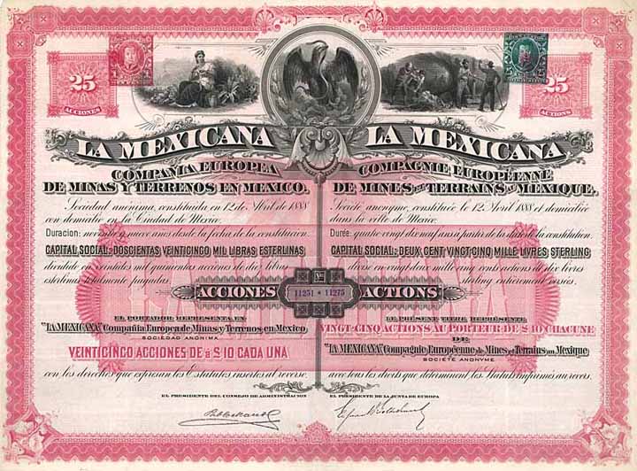 | Previous lot | Back | Next lot | | Lot: | 46 (Speculations) | | Title: | La Mexicana Cie. Europeenne de Mines et Terrains au Mexique | | Details: | Actions 25 x 10 £ 12.4.1888. Gründeraktien. | Starting price: | 1.000,00 EUR | Issuing- date: | 12.04.1888 | Issuing- place: | Mexico | | Picture: |  | | Number: | 11251-75 | | Info: | 1888 gegründete Minen- und Terrain-Gesellschaft. | | Specials: | Zweisprachig spanisch/französisch. Schöner Stahlstich mit dreigeteilter Vignette: Allegorie, Adler mit Schlange, Geschehen im Bergwerk. Mit eingedruckter Steuermarke mit Abb. des Präsidenten Porfirio Diaz (1830-1915). | | Availability: | Unentwertet, mit Kupons No. 1-25. | | Condition: | EF-VF. | | Sold: | unsold |