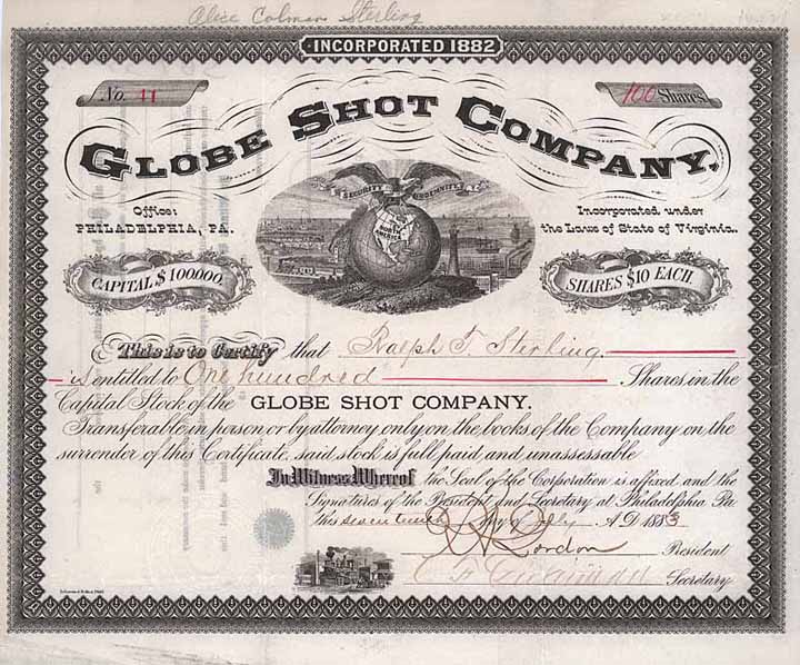 | Previous lot | Back | Next lot | | Lot: | 70 (U.S.A.) | | Title: | Globe Shot Co. | | Details: | 100 shares à 10 $ 17.7.1883. | Starting price: | 150,00 EUR | Issuing- date: | 17.07.1883 | Issuing- place: | Philadelphia | | Picture: |  | | Number: | 41 | | Info: | Gründung 1882. | | Specials: | Vignette mit Adler auf Globus, dahinter links Landschaft mit Eisenbahnen, rechts Segelschiffe und Leuchtturm; ganz unten kleine Lok-Vignette. | | Availability: | Äußerst selten, seit 1997 in der Sammlung. | | Condition: | VF+. | | Sold: | unsold |