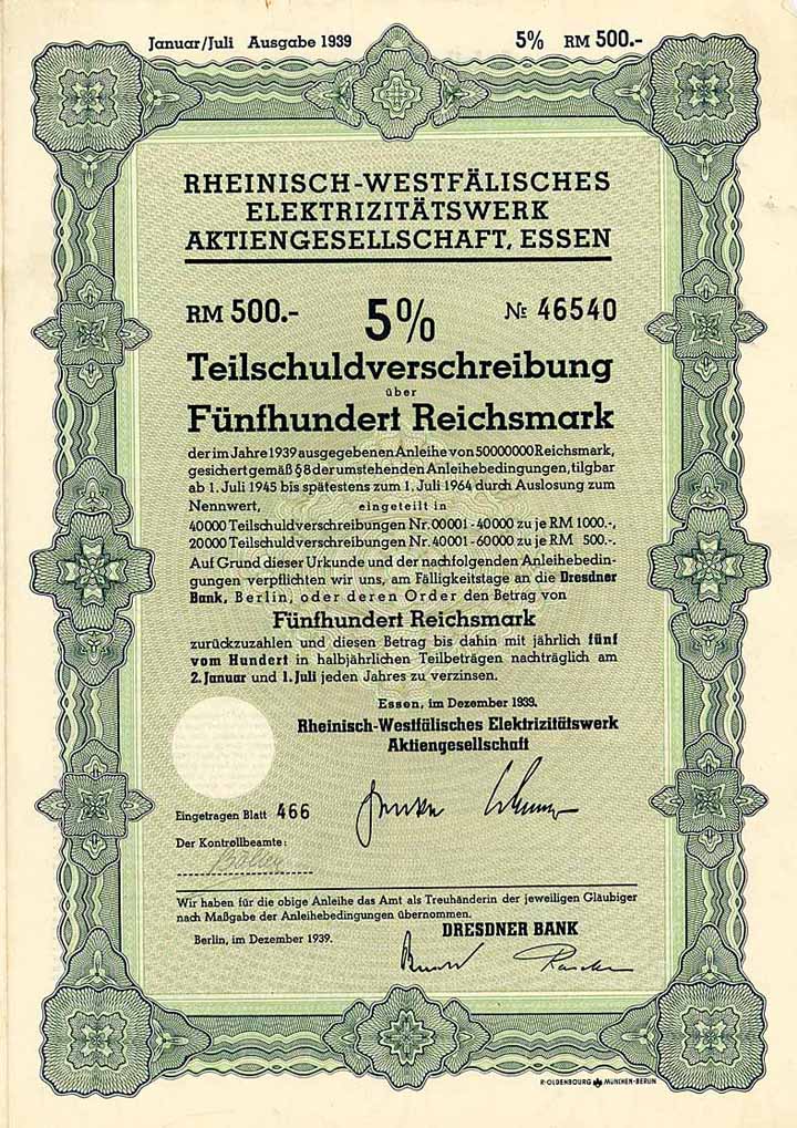 | Previous lot | Back | Next lot | | Lot: | 1234 (Germany until 1945 (No Reichsbank)) | | Title: | Rheinisch-Westfälisches Elektrizitätswerk AG | | Details: | 5 % Teilschuldv. 500 RM Dez. 1939 (Auflage 20000, R 10). | Starting price: | 40,00 EUR | Issuing- date: | 01.12.1939 | Issuing- place: | Essen | | Picture: |  | | Number: | 46540 | | Info: | Gründung 1898. Grundlage des Unternehmens war eine auf 40 Jahre erteilte Konzession der Stadt Essen zur Benutzung der städtischen Straßen und Plätze für die Leitungen elektrischer Energie. Die ursprünglich der "Elektrizitäts-AG vorm. W. Lahmeyer & Co." in Frankfurt a.M. erteilte Konzession wurde dem unter maßgeblichem Einfluss von Hugo Stinnes errichteten RWE abgetreten. 1899 Errichtung des ersten Kraftwerkes in Essen. Ab 1903 wurden benachbarte Kommunen nach Übernahme von Aktien und Aufsichtsratssitzen in eine überregionale Versorgung einbezogen. Im Laufe der Jahre entwickelte sich das RWE zum größten deutschen Energieversorgungsunternehmen und zu einem Konzern mit vielfältigen Aktivitäten außerhalb des angestammten Versorgungsbereichs. 1990 wurde die Gesellschaft konzernleitende Holding für die selbständigen Sparten Energie, Bergbau/Rohstoffe (Rheinbraun), Mineralöl/Chemie (RWE-DEA), Entsorgung, Maschinen- und Anlagenbau (Lahmeyer, Rheinelektra, Heidelberger Druck), Bau (Hochtief). | | Availability: | Nicht lochentwertet. (R 10) | | Condition: | UNC. | | Sold: | 40,00 EUR |