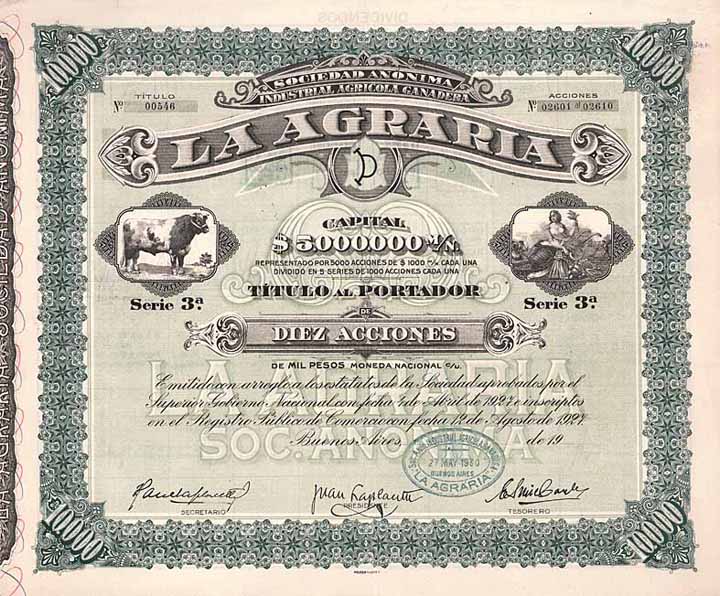 | Previous lot | Back | Next lot | | Lot: | 93 (Argentina) | | Title: | S.A. Industrial Agricola Ganadera La Agraria | | Details: | Accion Serie 3. 10 x 1.000 Pesos von 1927. | Starting price: | 80,00 EUR | Issuing- date: | 01.01.1927 | Issuing- place: | Buenos Aires | | Picture: |  | | Number: | 546 | | Info: | Die 1927 gegründete Gesellschaft betrieb mit gutem Erfolg Tierzucht auf eigenen landwirtschaftlichen Farmen. Sie wurde erst Anfang der 1960er Jahre liquidiert. | | Specials: | Großformatiges Papier, sehr dekorativ gestaltet, links ein Zuchtbulle, rechts Ceres, die römische Göttin der Landwirtschaft. | | Availability: | Nur das eine Stück in dieser Stückelung ist bekannt. | | Condition: | EF. | | Sold: | unsold |