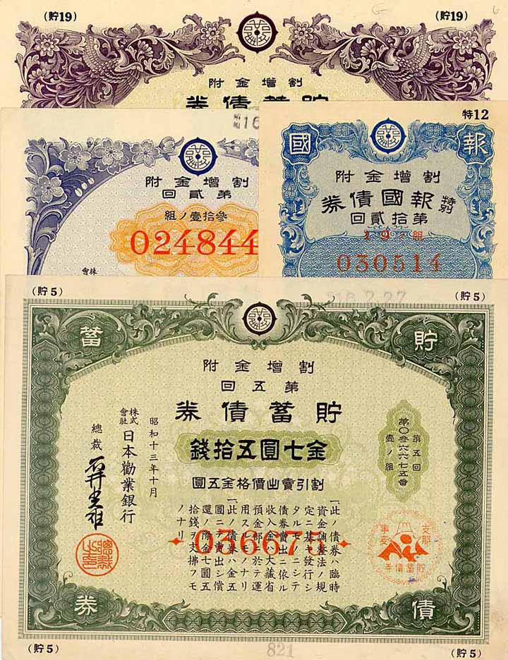 | Previous lot | Back | Next lot | | Lot: | 311 (Japan) | | Title: | Japanische Regierung (7 Kriegsanleihen) | | Details: | Staatsanleihen von 1938-1940. | Starting price: | 140,00 EUR | Issuing- date: | 01.01.1938 | | Picture: |  | | Specials: | Kleinformate, Anleihentext nur japanisch. Versch. Nominalwerte. | | Condition: | EF. | | Sold: | unsold |