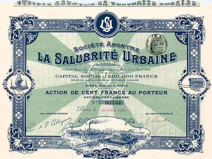 | Previous lot | Back | Next lot | | Lot: | 805 (Half starting price) | | Title: | S.A. La Salubrite Urbaine | | Details: | Action 100 F ohne Datum ca. 1905. | Starting price: | 35,00 EUR | Issuing- date: | 26.03.1905 | Issuing- place: | Paris | | Picture: |  | | Number: | 4165 | | Info: | Die 1904 gegründete Gesellschaft stellte gesundheitsfördernde Produkte her. | | Specials: | Sehr schöne Gestaltung mit drei Vignetten, u.a. Ansicht der Fabrik. | | Availability: | Anh. Kupons. | | Condition: | EF-VF. | | Sold: | 35,00 EUR |