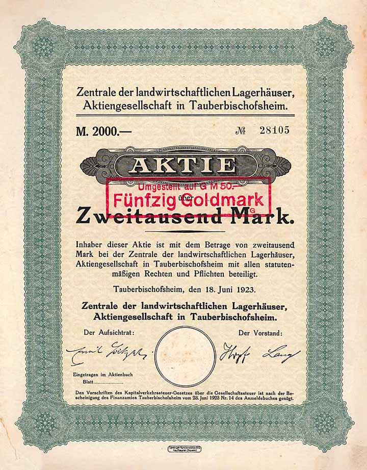 | Previous lot | Back | Next lot | | Lot: | 1376 (Germany until 1945 (No Reichsbank)) | | Title: | Zentrale der landwirtschaftlichen Lagerhäuser AG | | Details: | Aktie 2.000 Mark 18.6.1923 (Auflage 26250, R 9). | Starting price: | 75,00 EUR | Issuing- date: | 18.06.1923 | Issuing- place: | Tauberbischofsheim | | Picture: |  | | Number: | 21555 | | Info: | Gründung 1923. Die Gesellschaft besaß 13 Lagerhäuser in Baden, eine Dampfziegelei, eine Maschinenfabrik, Spinnerei und Strickerei und eine eigene Bank-Abteilung. Beteiligung an diversen Mühlen, Fleischwarenfabriken und Textilunternehmen. 1930 Vergleichsverfahren, über das Vermögen der Ges. wurde am 23.5.1930 das Konkursverfahren eröffnet. | | Availability: | Anh. Kupons. (R 9) | | Condition: | VF+. | | Sold: | unsold |