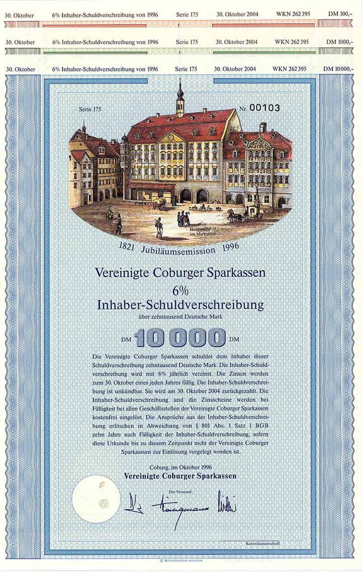| Previous lot | Back | Next lot | | Lot: | 1867 (Deutschland 1948-Today (Die Deutsche Mark)) | | Title: | Vereinigte Coburger Sparkassen (3 Stücke) | | Details: | 6 % Inh.-Schuldv. 100 DM, #1337; 1.000 DM, #3095 + 10.000 DM, #103 Okt. 1996. | Starting price: | 150,00 EUR | Issuing- place: | Coburg | | Picture: |  | | Specials: | Ausgegeben anläßlich des 175-jährigen Bestehens. Sehr dekorativ, mit bierdeckelgroßer farbiger Abb. der Sparkassen-Hauptstelle am Marktplatz im 19. Jh., außerdem Kuponbogen mit acht unterschiedlichen Abb. von Schlössern und Klöstern der Umgebung. | | Availability: | Alle mit Kuponbogen, auf jedem Kupon eine Sehenswürdigkeit. Entwertet. | | Condition: | UNC-EF. | | Sold: | 150,00 EUR |