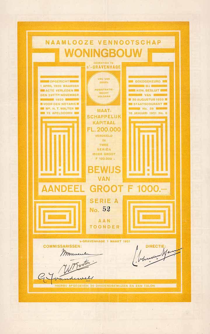 | Previous lot | Back | Next lot | | Lot: | 747 (Half starting price) | | Title: | N.V. Woningbouw | | Details: | Aandeel Serie A 1.000 fl. 1.3.1921 (Auflage 100). | Starting price: | 50,00 EUR | Issuing- date: | 01.03.1921 | Issuing- place: | s’-Gravenhage | | Picture: |  | | Number: | 52 | | Info: | Niederländische Wohnungsbau-Gesellschaft, 1920 gegründet. | | Specials: | Gelber Druck im Art Deko mit Originalunterschriften. | | Availability: | Anh. Kupons. | | Condition: | EF-VF. | | Sold: | unsold |