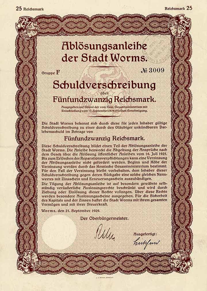 | Previous lot | Back | Next lot | | Lot: | 1319 (Germany until 1945 (No Reichsbank)) | | Title: | Stadt Worms | | Details: | Schuldv. 25 RM 21.9.1929 (R 10). | Starting price: | 50,00 EUR | Issuing- date: | 21.09.1929 | Issuing- place: | Worms | | Picture: |  | | Number: | 3009 | | Specials: | Auslosungsschein anhängend. | | Availability: | Nicht lochentwertet. (R 10) | | Condition: | EF. | | Sold: | 50,00 EUR |