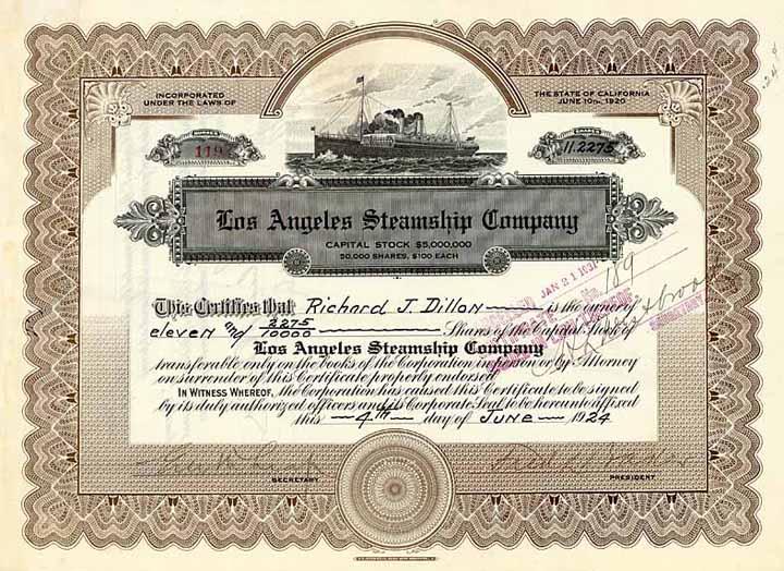 | Previous lot | Back | Next lot | | Lot: | 104 (U.S.A.) | | Title: | Los Angeles Steamship Co. | | Details: | 11 2.275/10.000 shares à 100 $ 4.6.1924. | Starting price: | 120,00 EUR | Issuing- date: | 04.06.1924 | Issuing- place: | Los Angeles, Cal. | | Picture: |  | | Number: | 119 | | Info: | Die 1920 gegründete LASSCO betrieb zunächst einen Schnelldampferdienst zwischen Los Angeles und San Francisco. 1921 warf sie der in San Francisco beheimateten Matson Navigation Co. den Fehdehandschuh hin und eröffnete zusätzlich einen Liniendienst nach Hawaii. Dafür kaufte die LASSCO von der U.S. Navy zwei früher dem NORDDEUTSCHEN LLOYD gehörende Ozeandampfer, die die Navy im 1. Weltkrieg beschlagnahmt hatte. Einer davon sank bereits auf seiner Jungfernfahrt nach Hawaii, doch in den boomenden 1920er Jahren konnte die LASSCO immer noch zusätzliche Linienverbindungen eröffnen und weitere Schiffe in Dienst stellen. Als im Morgengrauen der Weltwirtschaftskrise dann noch ein weiteres Schiff vor Hawaii durch Feuer zerstört wurde, mußte sich die LASSCO ihrem Erzrivalen Matson Navigation geschlagen geben und sich 1931 von ihm übernehmen lassen. 1937 wurden die LASSCO-Dienste eingestellt. | | Specials: | Braunviolett/schwarzer Stahlstich, tolle Vignette mit einem großen Passagierdampfer. | | Availability: | Erstmals überhaupt auf einer Auktion, wahrscheinlich ein Einzelstück. | | Condition: | EF-VF. | | Sold: | 150,00 EUR |