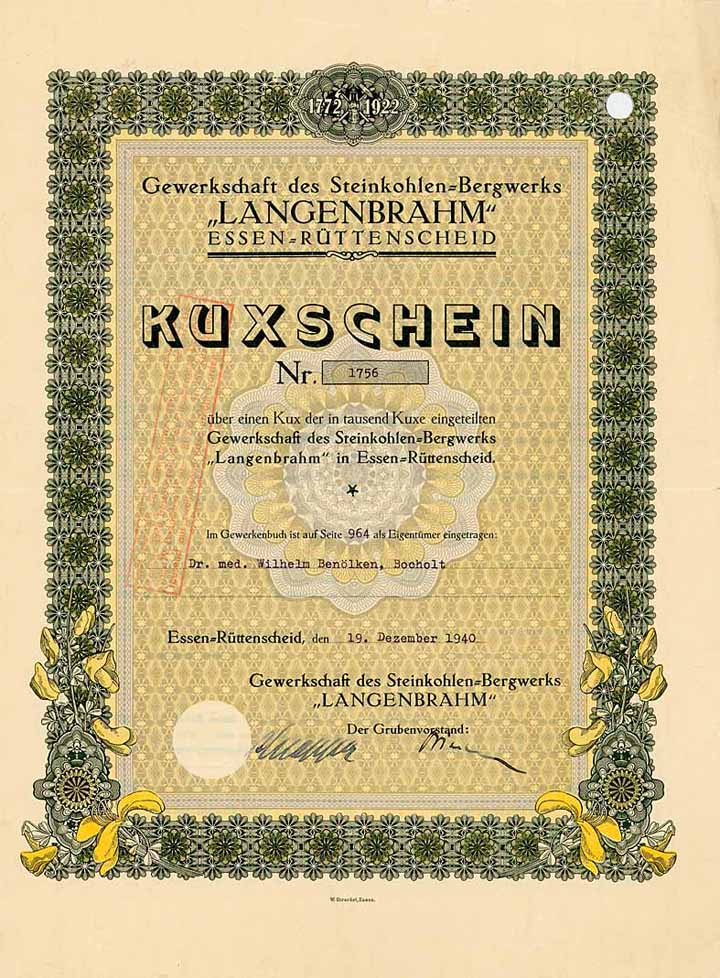 | Previous lot | Back | Next lot | | Lot: | 1021 (Germany until 1945 (Reichsbank)) | | Title: | Gewerkschaft des Steinkohlen-Bergwerks Langenbrahm | | Details: | Kuxschein 1 Kux von 1000 19.12.1940 (R 7). | Starting price: | 100,00 EUR | Issuing- date: | 19.12.1940 | Issuing- place: | Essen-Rüttenscheid | | Picture: |  | | Number: | 1756 | | Info: | 1772 verlieh der Abt Anselmus von Werden, der das Bergregal ausübte, an "Brächter und Konsorten" die Erlaubnis, eine Kohlenbank bei der Kluse im heutigen Essener Stadtwald abzubauen. 1804 nahm das Bergwerk die Bezeichnung "Gewerkschaft der Zeche Langenbrahm" an. Durch unspektukaläre, aber stetige Übernahmen weiteren Felderbesitzes stieg die Förderung bis 1938 auf 0,8 Mio. t im Jahr bei 2900 Mann Belegschaft. 1954 Umwandlung der Gewerkschaft in die Langenbrahm Steinkohlenbergbau AG. 1966 Einstellung der Kohleförderung, die Schächte wurden verfüllt, die Anlagen abgebrochen und es erfolgte die Umfirmierung in Langenbrahm AG. 1976 Erwerb der Aktienmehrheit der AUTO UNION Verwaltungs- und Beteiligungs-AG, Essen (später Autania). In diese Ägide unter dem heute kaum noch bekannten Immobilien-Tycoon Dr. Renatus Rüger (Intergrund-Gruppe) fiel die Geburtsstunde eines später strahlenden Sterns am Himmel der Immobilien-AG’s: Eine der Langenbrahm-Beteiligungen via Autania war die 1766 gegründete Württembergische Cattunmanufactur AG, Heidenheim (WCM). 1988 Umwandlung in eine Grundstücks-KG. | | Specials: | Lochentwertet (RB). | | Availability: | R 7 | | Condition: | EF-VF. | | Sold: | 100,00 EUR |