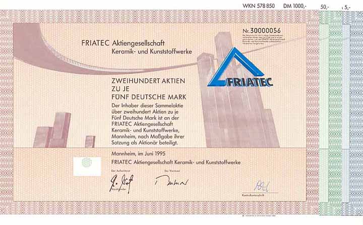 | Previous lot | Back | Next lot | | Lot: | 1247 (Deutschland 1948-Today (Die Deutsche Mark)) | | Title: | FRIATEC AG Keramik- und Kunststoffwerke (3 Stücke) | | Details: | Aktie 5 DM, #4156, 10 x 5 DM, #20003056; 200 x 5 DM, #30000056 Juni 1995. | Starting price: | 100,00 EUR | Issuing- place: | Mannheim | | Picture: |  | | Info: | 1863: Gründung der Reinhard’sche Zieglewaarenfabrik. 1876: Umfirmierung in J. F. Espenschied Portland-Cement- und Thonwaarenfabrik Friedrichsfeld. 1890: Umwandlung in die “Badische Thonröhren- und Steinzeugwaarenfabrik AG vorm. J. F. Espenschied”. 1895: Umfirmierung in "Deutsche Steinzeugwaarenfabrik für Canalisation und Chemische Industrie". 1918: Angliederung der Süddeutsche Steinzeugwerke GmbH, Muggensturm bei Rastatt. 1934: Übernahme von Aktien der Annawerk, Schamotte- und Tonwarenfabrik AG vorm. J.R. Geith, Oeslau. 1945: Hauptwerk zu 25 % zerstört. 1956: Beteiligung an der neugegründeten Dt. Ton- und Steinzeug-Werke AG, Kassel. 1966: Umfirmierung in “Deutsche Steinzeug- und Kunststoffwarenfabrik Verwaltungs-AG”. 1993: Umfirmierung in FRIATEC AG Keramik- und Kunststoffwerke. Seit 1995 auch börsennotiert. | | Availability: | Prägesiegel lochentwertet. | | Condition: | UNC-EF. | | Sold: | unsold |