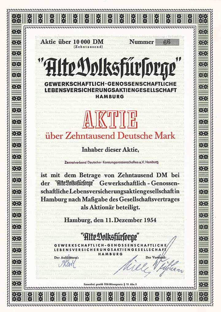 | Previous lot | Back | Next lot | | Lot: | 1106 (Deutschland 1948-Today (Die Deutsche Mark)) | | Title: | Alte Volksfürsorge Gewerkschaftlich-Genossenschaftliche Lebensversicherungs-AG | | Details: | Namensaktie 10.000 DM 11.12.1954 (Auflage NUR 50 STÜCK, R 7). | Starting price: | 180,00 EUR | Issuing- date: | 11.12.1954 | Issuing- place: | Hamburg | | Picture: |  | | Number: | 46 | | Info: | “Keine Sorge, Volksfürsorge” war einer der bekanntesten Slogans der Versicherungswirtschaft. Die Volksfürsorge wurde 1913 als Selbsthilfeeinrichtung der deutschen Arbeiterbewegung gegründet, sie bot alle Arten von Lebensversicherungen an. Das Kapital lag je zur Hälfte bei den Gewerkschaften und bei den Konsumgenossenschaften der Hamburger Richtung. Im Dritten Reich wurde die Volksfürsorge in die Deutsche Arbeitsfront (DAF) eingegliedert und stieg mit 7,1 Mio. Versicherten zur größten deutschen Versicherung auf. Umfirmiert 1947 in “Alte Volksfürsorge” und „1968 in Volksfürsorge Lebensversicherung AG“. 1974 wurde die gerade gegründete gewerkschaftseigene Beteiligungsgesellschaft für Gemeinwirtschaft (BGAG) Mehrheitsaktionär. Nach deren Beinahe-Zusammenbruch als Folge des Neue-Heimat-Desasters wurde 1988 der AMB Generali-Konzern neuer Großaktionär. 2002 Rauswurf der restlichen Minderheitsaktionäre der bis dahin börsennotierten AG per squeeze-out. 2008 fusionierte der Generali-Konzern seine deutschen Töchter „Aachener und Münchener“ und „Volksfürsorge“ zur „Generali Versicherung AG“. | | Specials: | Ausgestellt auf den Zentralverband Deutscher Konsumgenossenschaften e.V. Hamburg. | | Availability: | R 7 | | Condition: | UNC-EF. | | Sold: | unsold |