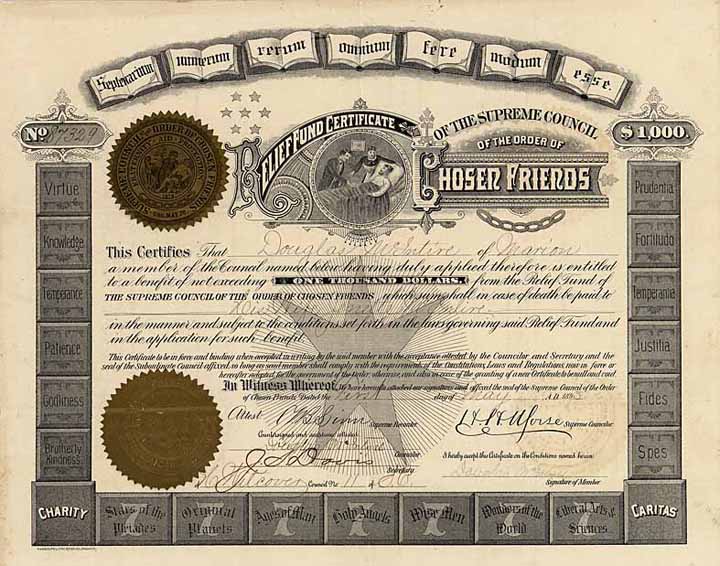 | Previous lot | Back | Next lot | | Lot: | 217 (U.S.A.) | | Title: | Supreme Council of the Order of Chosen Friends | | Details: | Relief Fund Certificate 1.000 $ 1.5.1893. | Starting price: | 150,00 EUR | Issuing- date: | 01.05.1893 | Issuing- place: | Marion | | Picture: |  | | Number: | 87329 | | Info: | Die Order of Chosen Friends war ein brüderlicher Wohltätigkeitsverein, der in Nordamerika im späten 19. Jh. und frühen 20. Jh. existierte. Originär gegründet durch eine Gruppe von Menschen, vor allem Freimaurern, die eine Organisation einrichten wollten, um alte Leute und Kranke zu unterstützen. Am 28. Mai 1879 wurde die OMC in Indianapolis, Indiana gegründet. | | Specials: | Sehr dekorativ, mittig ein Kranker, der versorgt wird und rundherum sind Sinn und Zweck des Ordens aufgeführt. Goldenes Siegel, Originalunterschriften. | | Condition: | EF-VF. | | Sold: | 150,00 EUR |
