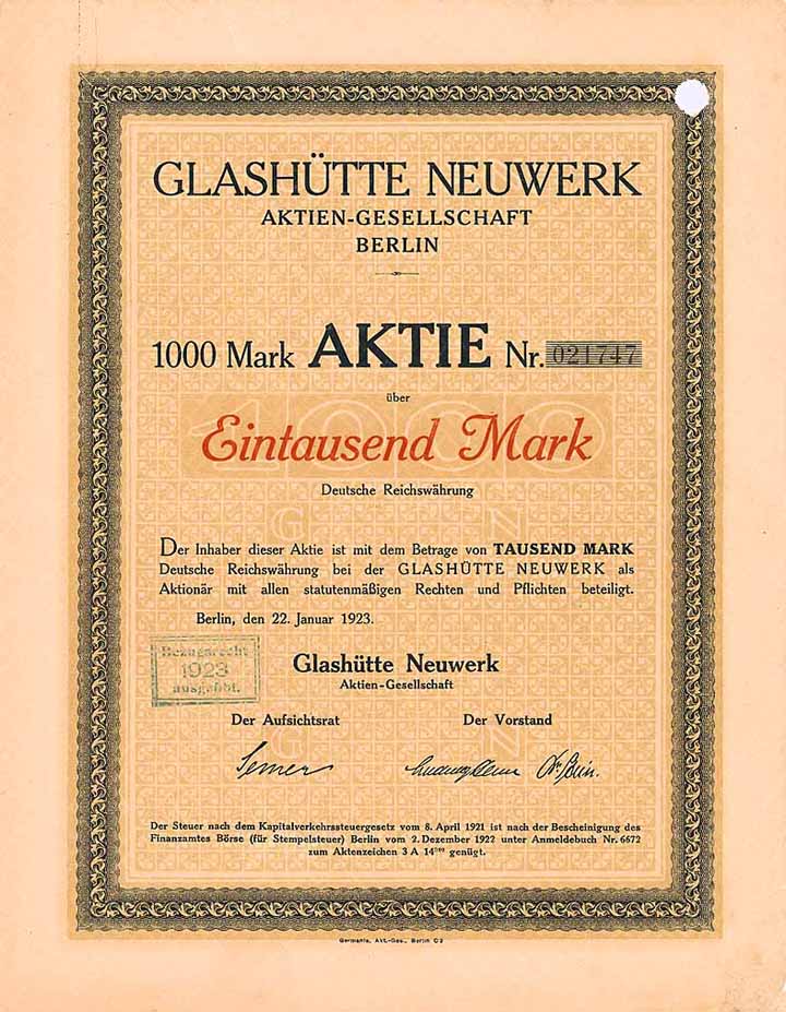 Info:Gründung 1921 durch Fusion der Glasfabrik Neuwerk (bei Hannover) mit der Fa. Ludwig Henn Hohlglas en gros und der Glasinstrumentenfabrik E. Geissler & Co. in Berlin. Herstellung von Hohlglas und Glasinstrumenten für chemische, pharmazeutische und technische Zwecke. Notierte im Freiverkehr der Börsen Hannover und Magdeburg. 1928 Sitzverlegung nach Schmiedefeld (Kreis Schleusingen), 1937 Übertragung des Gesellschaftsvermögens auf den Hauptaktionär Adam Heinz Glashütte Friedrichswerk.