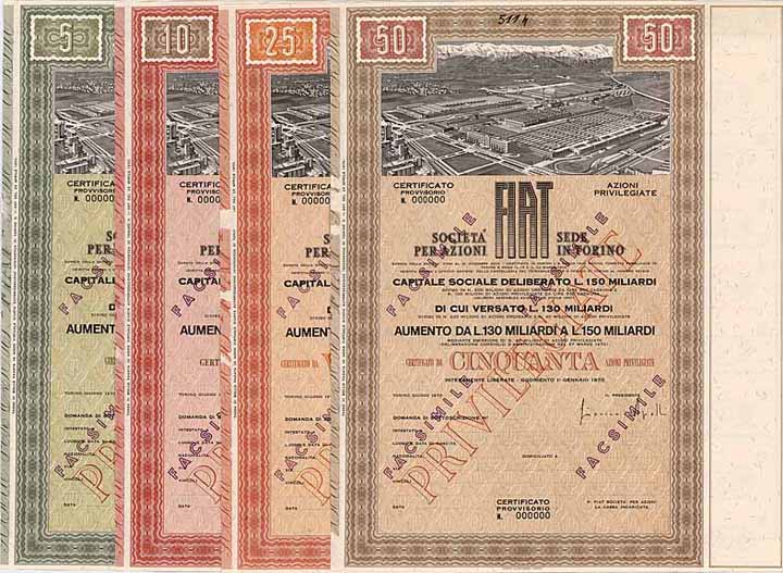 | Previous lot | Back | Next lot | | Lot: | 304 (Italien) | | Title: | FIAT S.p.A. (6 Stücke) | | Details: | VZ-Aktien 1, 2, 5, 10, 25 + 50 Mai 1.1.1970 (Muster, mit Faksimile-Unterschrift Giovanni Agnelli, R 10). | Starting price: | 1.200,00 EUR | Issuing- place: | Torino | | Picture: |  | | Info: | Giovanni Agnelli, der Graf von Ruffia und der Graf von Bricherasio gründeten 1899 die FIAT-Werke (Fabbrica Italiana Automobili Torino). 1906 wurde das Unternehmen eine AG. Anfang der 20er Jahre eröffnete eine bedeutende Erweiterung der Produktion den Weg zum Massen-Hersteller. In den letzten Jahren lieferte sich FIAT mit VW einen ständigen Kampf um die Spitzenposition auf dem europäischen Markt. Meist gewinnt VW, doch FIAT kann sich rühmen, mit über 100 Jahren die wesentlich längere Automobil-Tradition zu besitzen. Zum FIAT-Konzern gehörte u.a. auch die Edelmarke Lamborghini sowie Alfa Romeo. Ende der 1990er Jahre beteiligte sich General Motors an der FIAT-Autosparte. Erst war eine langfristige Komplettübernahme geplant, doch 2004 war die finanziell kurzatmige GM froh, sich aus dem Engagement wieder herauskaufen zu können. | | Specials: | Großes Hochformat, riesige Ansicht des gigantischen FIAT-Werkes bei Turin aus der Vogelperspektive. | | Availability: | Belegstücke der Frankfurter Börse handschriftlich numeriert (#511). (R 10) | | Condition: | EF. | | Sold: | unsold |