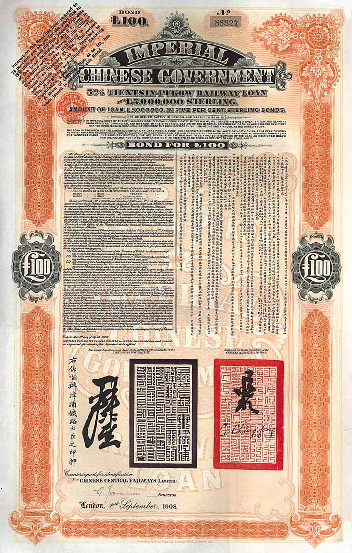 | Previous lot | Back | Next lot | | Lot: | 246 (China) | | Title: | Imperial Chinese Government 5 % Tientsin-Pukow Railway Loan | | Details: | 5 % Bond 100 £ 1.9.1908 (Ku 170 A). | Starting price: | 60,00 EUR | Issuing- date: | 01.09.1908 | | Picture: |  | | Number: | 33326 | | Info: | Die Tientsin-Pukow-Eisenbahn verband die Bahnen in Nordchina mit dem Shanghai-Nanking-System. Der nördliche Teil mit Anschluß auch an die deutsche Schantung-Eisenbahn wurde von deutschen Generalunternehmern gebaut. Für den südlichen Teil bis Pukow am Yang-Tze-Kiang zeichneten britische Kontraktoren verantwortlich. | | Specials: | Teil einer Anleihe von 5 Mio. £, je zur Hälfte aufgelegt in London und Berlin. Zweisprachig englisch/chinesisch. Großformatiger orange/schwarz/roter Stahlstich von Waterlow & Sons. | | Availability: | Mit kpl. anh. Kupons. | | Condition: | EF. | | Sold: | 65,00 EUR |