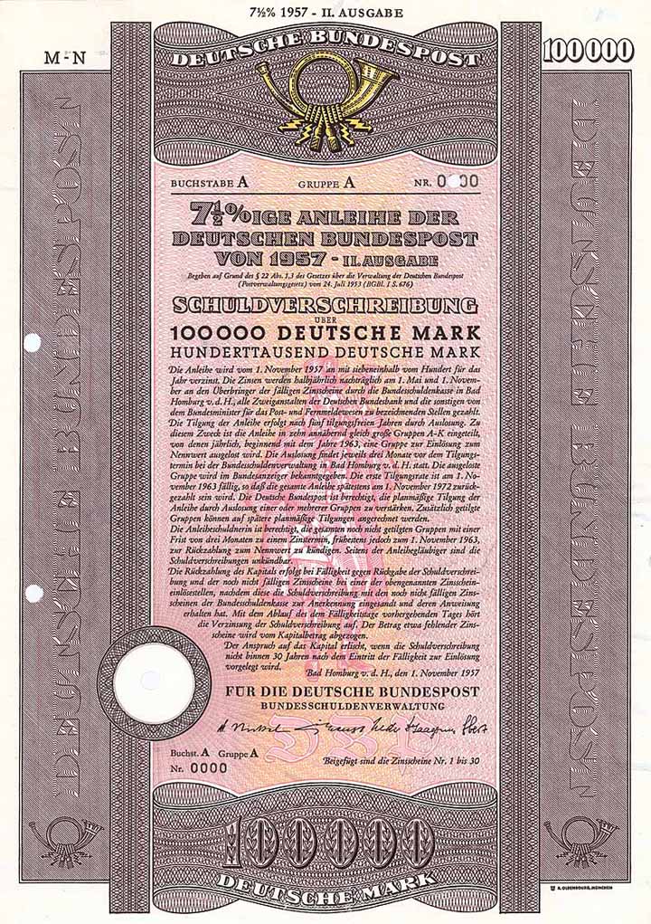 | Previous lot | Back | Next lot | | Lot: | 1519 (Deutschland 1948-Today (Die Deutsche Mark)) | | Title: | Deutsche Bundespost | | Details: | 7,5 % Schuldv. 100.000 DM 1.11.1957 (nullgeziffertes Muster, R 10). | Starting price: | 60,00 EUR | Issuing- date: | 01.11.1957 | Issuing- place: | Bad Homburg v.d.H. | | Picture: |  | | Info: | Nachfolgerin der Deutschen Reichspost, die mit der Reichsgründung 1871 aus der 1868 entstandenen Norddeutschen Bundespost entstanden war. Zunächst ein reichs- bzw. später bundesunmittelbares Unternehmen, mit der Postreform 1989 aufgeteilt in die eigenständigen Unternehmensbereiche DBP Postbank, DBP Postdienst und DBP Telekom, die später privatisiert und jeder für sich als Aktiengesellschaft an die Börse gebracht wurden. | | Specials: | Wunderschöner Oldenbourg-Druck, Vignette mit leuchtend gelbem Posthorn, im Unterdruck ein Postillion mit Briefumschlag und Posthorn. | | Availability: | Abheftlochung. (R 10) | | Condition: | UNC-EF. | | Sold: | 60,00 EUR |