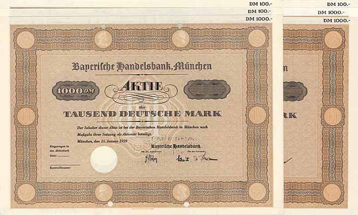 | Previous lot | Back | Next lot | | Lot: | 1453 (Deutschland 1948-Today (Die Deutsche Mark)) | | Title: | Bayerische Handelsbank (6 Stücke) | | Details: | Aktie 100 DM (Blankette) + 1.000 DM (Muster) 15.1.1959; 100 DM (Blankette) 20.6.1963; 100 DM (Muster) + 1.000 DM (Blankette 10.7.1964; 1.000 DM (Blankette) 28.3.1972. | Starting price: | 180,00 EUR | Issuing- place: | München | | Picture: |  | | Info: | 1869 Gründung der Bayerischen Handelsbank als Kreditbank. 1871 Angliederung einer Bodencreditanstalt. 1921 Übertragung der Geschäftsbank auf die Bayerische Vereinsbank, seitdem reine Hypothekenbank. Börsennotiert bis 2002, als die Bayerische Handelsbank mit den anderen Realkredit-Töchtern der HypoVereinsbank fusioniert wurde. Letztlich Teil der später skandalumwitterten Hypo Real Estate geworden. | | Condition: | UNC-EF. | | Sold: | unsold |