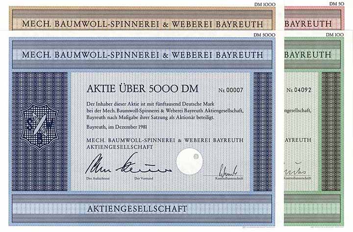 | Previous lot | Back | Next lot | | Lot: | 1632 (Deutschland 1948-Today (Die Deutsche Mark)) | | Title: | Mech. Baumwoll-Spinnerei & Weberei Bayreuth (4 Stücke) | | Details: | Aktie 50 DM, #357, 100 DM, #4092, 1.000 DM, #1041 + 5.000 DM, #7 Dez. 1981. | Starting price: | 100,00 EUR | Issuing- place: | Bayreuth | | Picture: |  | | Info: | Gründung 1853 als "Mech. Baumwollen-Spinnerei zu Bayreuth". Nach Errichtung einer Weberei 1887 Umfirmierung wie oben. 1921 Erwerb der Aktienmehrheit der Württembergischen Cattunmanufactur (1976 veräußert). 1929 Erwerb einer stillgelegten Flachspinnerei in Laineck und Umbau in eine Weberei (Werk 2). Bis Kriegsende auch an der Flockenbast AG, Plauen i.V. mehrheitlich beteiligt. 1961 Gründung der Bayreuther Wirkwarenfabrik Stelzmann GmbH, die erst kontinuierlich erweitert, aber 1977 wieder abgestossen wurde. 1967 Tausch der Anteile an der Süddeutschen Chemiefaser AG, Kelheim in Hoechst-Aktien. 1981 ging die in München börsennotierte AG in Vergleich. 1982 Stilllegung des Betriebsteiles Laineck und Übertragung der Weberei auf die WEBATEX GmbH & Co. KG. 1984 endet mit Stilllegung der Spinnerei die aktive Geschäftstätigkeit. Den Kleinaktionären wird angeboten, ihre Aktien in solche der Neue Baumwoll-Spinnerei & Weberei Hof AG zu tauschen. 1985 übernimmt der Textilunternehmer Claas E. Daun aus Rastede 99 % der Aktien. | | Availability: | Lochentwertet. | | Condition: | UNC-EF. | | Sold: | 100,00 EUR |