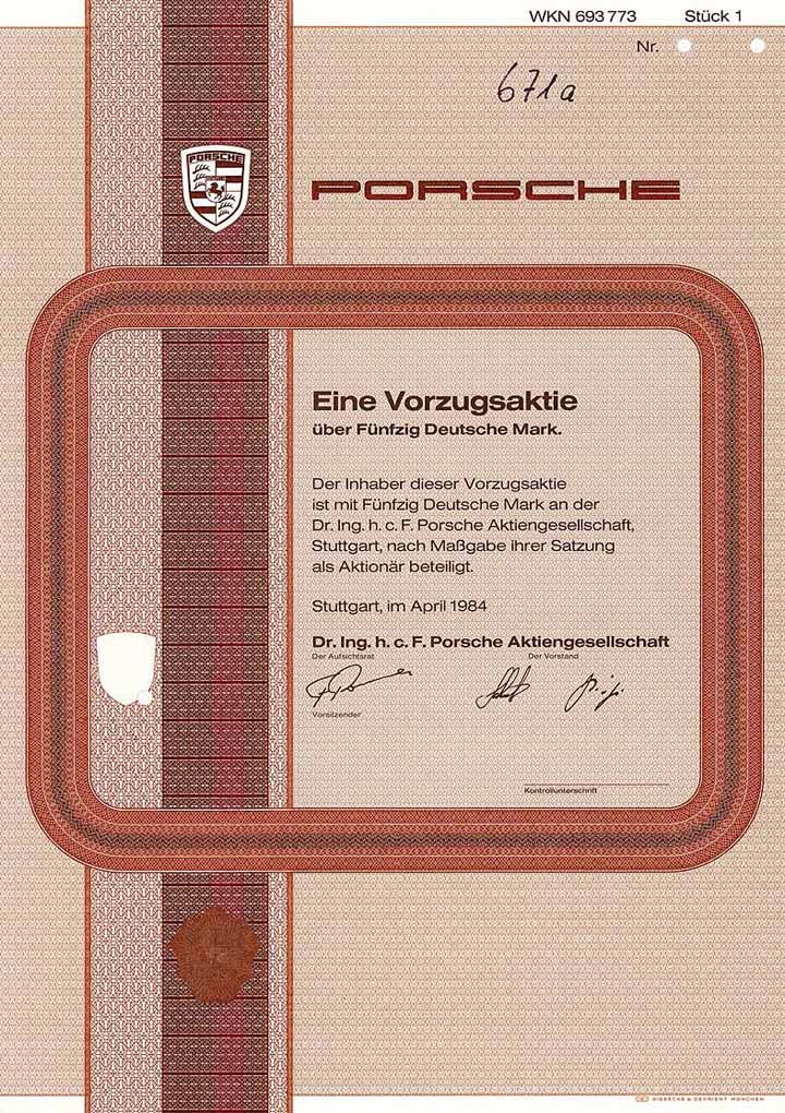 | Previous lot | Back | Next lot | | Lot: | 1536 (Deutschland 1948-Today (Die Deutsche Mark)) | | Title: | Dr. Ing. h.c. F. Porsche AG | | Details: | VZ-Aktie 50 DM April 1984 (Muster, R 10). | Starting price: | 50,00 EUR | Issuing- date: | 01.04.1984 | Issuing- place: | Stuttgart | | Picture: |  | | Info: | Der Name Ferdinand Porsche taucht seit der Wende zum 20. Jh. in der Geschichte des Automobils immer wieder auf: bei Lohner, bei Austro-Daimler, bei Daimler und Steyr und schließlich als Konstrukteur des legendären “Volkswagen”. Ab 1931 war Porsche mit seinem Konstruktionsbüro (zunächst eine GmbH) in Stuttgart ansässig, während des Krieges verlagerte er die Firma ins österreichische Gmünd. Hier entstand 1948 der erste “Porsche”, ein zweisitziger Sportwagen mit Aluminium-Karosserie und einem von VW abgeleiteten luftgekühlten Motor. Die erste Serie von 50 Fahrzeugen wurde in Österreich und teilweise in der Schweiz gebaut. 1950 wurde im Werk Stuttgart-Zuffenhausen die Produktion des Typ 356 aufgenommen. Von Anfang an hatten Porsche-Wagen auch im Motorsport beachtliche Erfolge. Der heute größte Sportwagenhersteller der Welt wurde 1973 in eine AG umgewandelt und ging 1984 mit Vorzugsaktien an die Börse. Die Stammaktien sind nach wie vor vollständig im Besitz der Familien Porsche/Piech. Nach dem fulminanten und Wellen schlagenden Einstieg bei VW 2008 Umwandlung in eine Holding. | | Specials: | Moderner Sicherheitsdruck mit Porsche-Emblem. | | Availability: | Belegstück der Frankfurter Börse handschriftlich numeriert (#671a). Rückseitig Klebereste. (R 10) | | Condition: | EF-VF. | | Sold: | unsold |