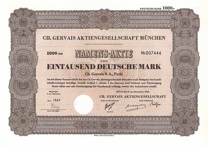 | Previous lot | Back | Next lot | | Lot: | 1498 (Deutschland 1948-Today (Die Deutsche Mark)) | | Title: | Ch. Gervais AG | | Details: | Namens-Aktie 1.000 DM Nov. 1965 (Auflage 4000, R 6). | Starting price: | 40,00 EUR | Issuing- date: | 01.11.1965 | Issuing- place: | München | | Picture: |  | | Number: | 7409 | | Info: | Gründung 1920. Heute die französische Danone S.A., 1999 mit ca. 26 Mrd. DM Umsatz und 80.000 Mitarbeitern der drittgrößte europäische Nahrungsmittelhersteller. Danone S.A. ist Weltmarktführer bei Milchprodukten (Danone, Galbani) und Keksen (De Beukelaer Lu). Im internationalen Mineralwassermarkt belegte der Konzern 1999 mit Evian und Volvic den zweiten Platz. Die deutsche Danone GmbH mit Sitz in München ist einer der Top-Anbieter von Molkereiprodukten wie Fruchtzwerge, Dany Sahne und Gervais Obstgarten - mutig beworben unter anderen mit “Fußball-Erfolgstrainer” Berti Vogts. | | Availability: | R 8 | | Condition: | EF+. | | Sold: | unsold |
