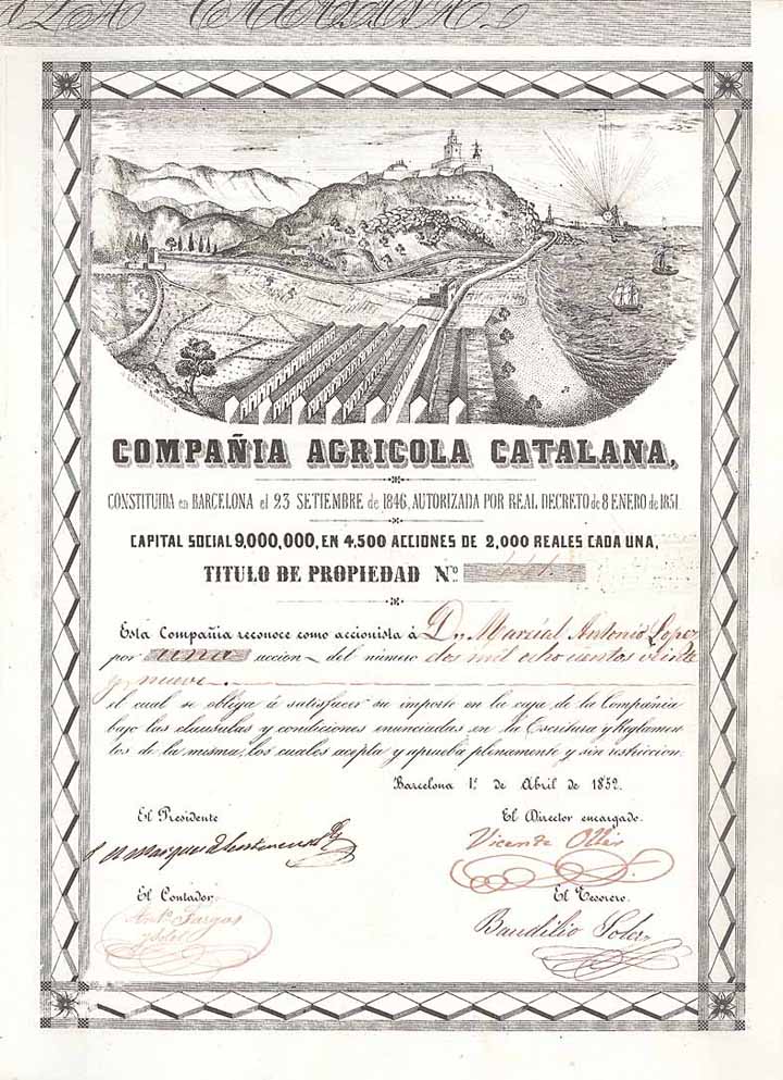 | Previous lot | Back | Next lot | | Lot: | 414 (Spanien) | | Title: | Cia. Agricola Catalana | | Details: | Accion 2.000 Reales Cada Una 1.4.1852. | Starting price: | 100,00 EUR | Issuing- date: | 01.04.1852 | Issuing- place: | Barcelona | | Picture: |  | | Number: | 441 | | Info: | Die Gesellschaft wurde am 23.9.1846 konstituiert. | | Specials: | Herrliche Gestaltung mit Abb. von Feldern, Häusern, einer Burg, Segelschiffen am Meeresufer, aufgehende Sonne. | | Condition: | EF. | | Sold: | 100,00 EUR |