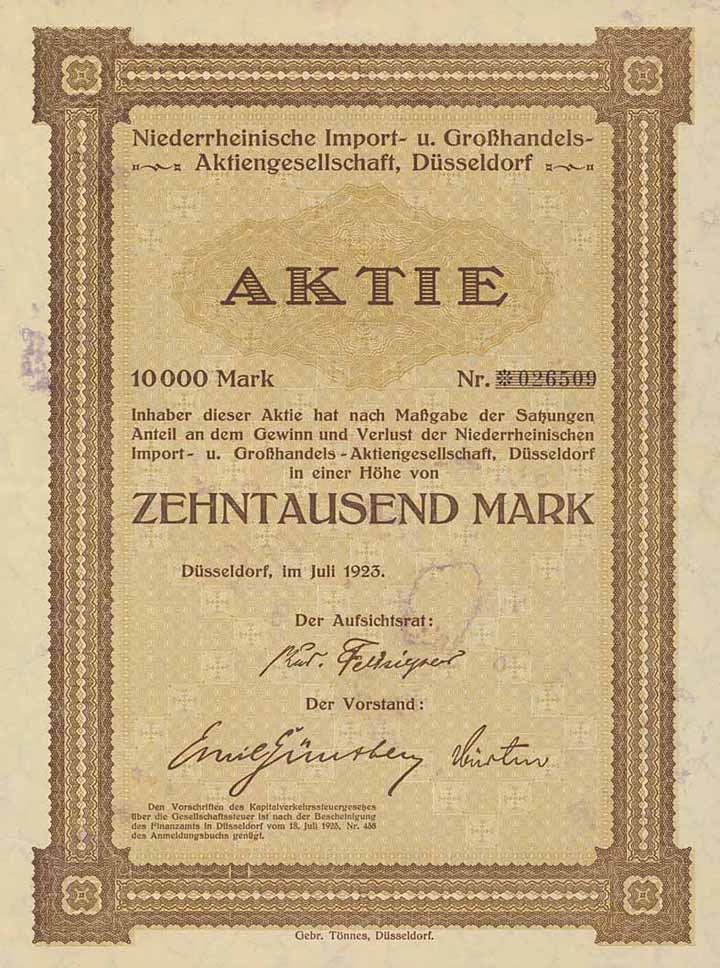 | Previous lot | Back | Next lot | | Lot: | 1355 (Germany until 1945 (No Reichsbank)) | | Title: | Niederrheinische Import- u. Großhandels-AG | | Details: | Aktie 10.000 Mark Juli 1923. Gründeraktie (Auflage 28500, R 10). | Starting price: | 50,00 EUR | Issuing- date: | 01.07.1923 | Issuing- place: | Düsseldorf | | Picture: |  | | Number: | 26508 | | Info: | Gründung am 11.7.1923 zwecks Herstellung, Vertrieb, Ein- und Ausfuhr von Lebens- und Futtermitteln. Gründer: Emil Günther, Laurenz Hürten, Rudolf Feldsieper, Jean Rossbach, Dr. Rudolf Hendel, Wilhelm Grammann, August Hanten und Carl Koch, Düsseldorf. | | Availability: | R 10 | | Condition: | EF-VF. | | Sold: | unsold |