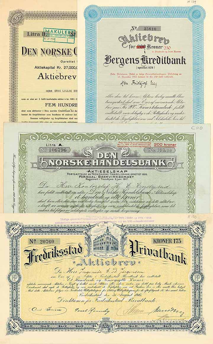 | Previous lot | Back | Next lot | | Lot: | 642 (Banken) | | Title: | Norwegen - Banken-Konvolut (13 Stücke) | | Details: | Aktien von 1913 bis 1934. | Starting price: | 150,00 EUR | | Picture: |  | | Specials: | Aalesunds Kreditbank 1918; Andresens Bank 1913 + 1919 + 1919; Bergens Kreditbank 1916; Den Nordenfjeldske Kreditbank 1919; Den Norske Creditbank 1934; Frederiksstad Privatbank 1919 + 1916; Den Norske Handelsbank 1917; AB Porsgrunds Handelsbank 1916; Sondenfjelske Privatbank 1917; Tromso Handelsbank 1918. | | Condition: | EF-VF. | | Sold: | 150,00 EUR |