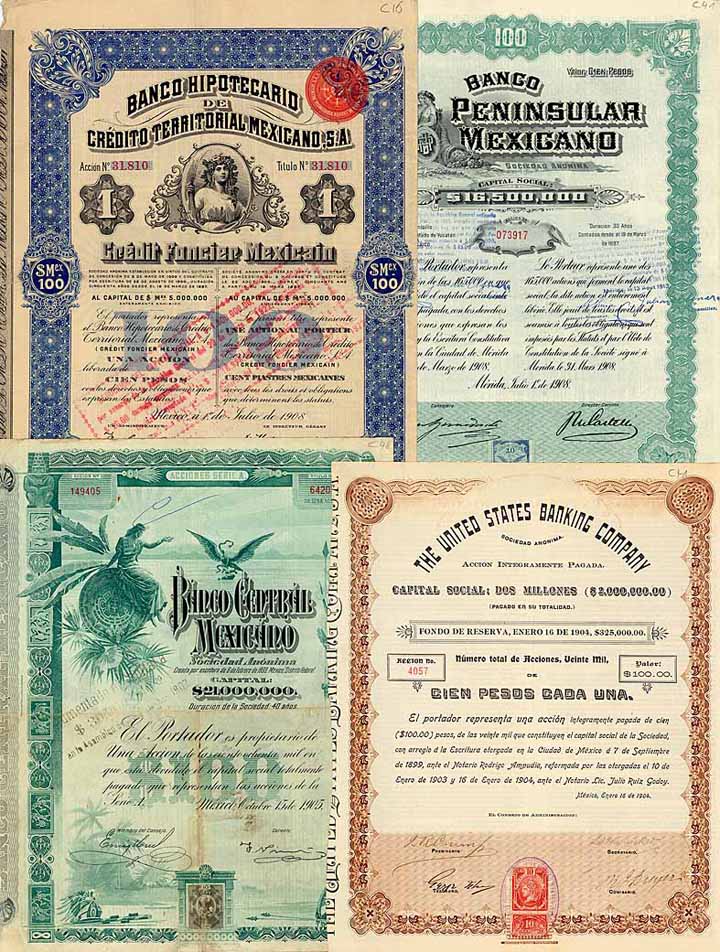 | Previous lot | Back | Next lot | | Lot: | 626 (Banken) | | Title: | Mexico - Banken-Konvolut (10 Stück) | | Details: | Wertpapiere von 1904 bis 1969. | Starting price: | 100,00 EUR | | Picture: |  | | Specials: | Nacionel Financiera 1969; United States Banking Co. Mexico 1904; Cia. Bangaria de Fomento y Bienes Raiges de Mexico 1910; Banco Penninsular Mexicano 2x 1908; Banco Hipotecario de Credito Territorial Mexicano 1908; Banco de Guanajuato 1906; Banco Central Mexicano 3 x 1905. | | Condition: | EF-VF. | | Sold: | 110,00 EUR |