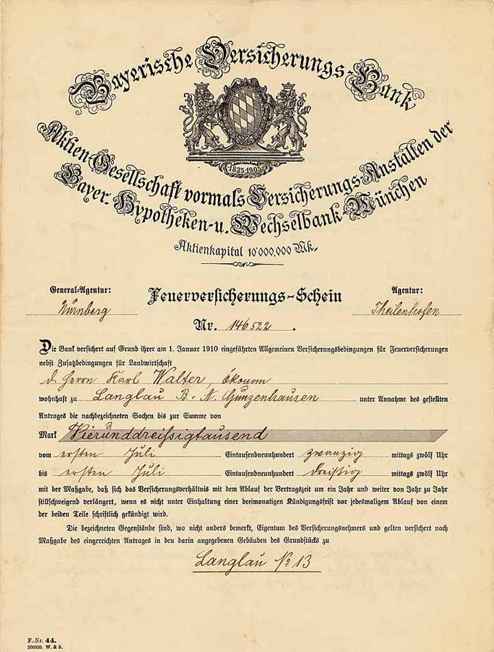 | Previous lot | Back | Next lot | | Lot: | 441 (Varia, Literatur) | | Title: | Bayerische Versicherungs-Bank AG vormals Versicherungs-Anstalten der Bayer. Hypotheken- u. Wechselbank | | Details: | Feuerversicherungsschein 34.000 Mark 1.7.1920. | Starting price: | 60,00 EUR | Issuing- date: | 29.05.1918 | Issuing- place: | Nürnberg | | Picture: |  | | Number: | 146522 | | Info: | 1905 wurden die Versicherungsgeschäfte der Bayerischen Hypotheken- und Wechsel-Bank in die "Bayerische Versicherungsbank AG" ausgegliedert, 1923 an Münchener Rück und Allianz verkauft. | | Specials: | Dekorative, mehrseitige Urkunde mit bayerischem Wappen. | | Condition: | VF+. | | Sold: | 70,00 EUR |