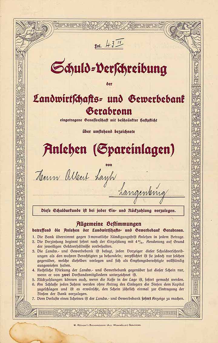 | Previous lot | Back | Next lot | | Lot: | 1316 (Germany until 1945 (No Reichsbank)) | | Title: | Landwirtschafts- und Gewerbebank mbH | | Details: | 4 % Schuld-Verschreibung von 1920 (R 10). | Starting price: | 60,00 EUR | Issuing- date: | 01.01.1920 | Issuing- place: | Gerabronn | | Picture: |  | | Number: | 43 IV | | Specials: | Spareinlagen, Doppelblatt, schöne Gestaltung mit Jugendstil-Elementen. | | Availability: | R 10 | | Condition: | VF+. | | Sold: | unsold |